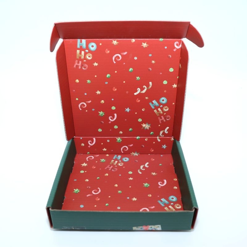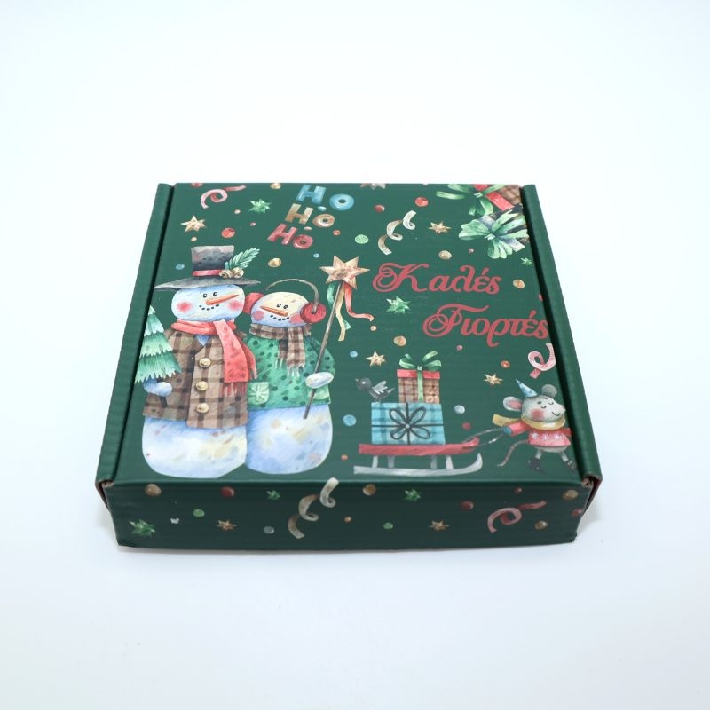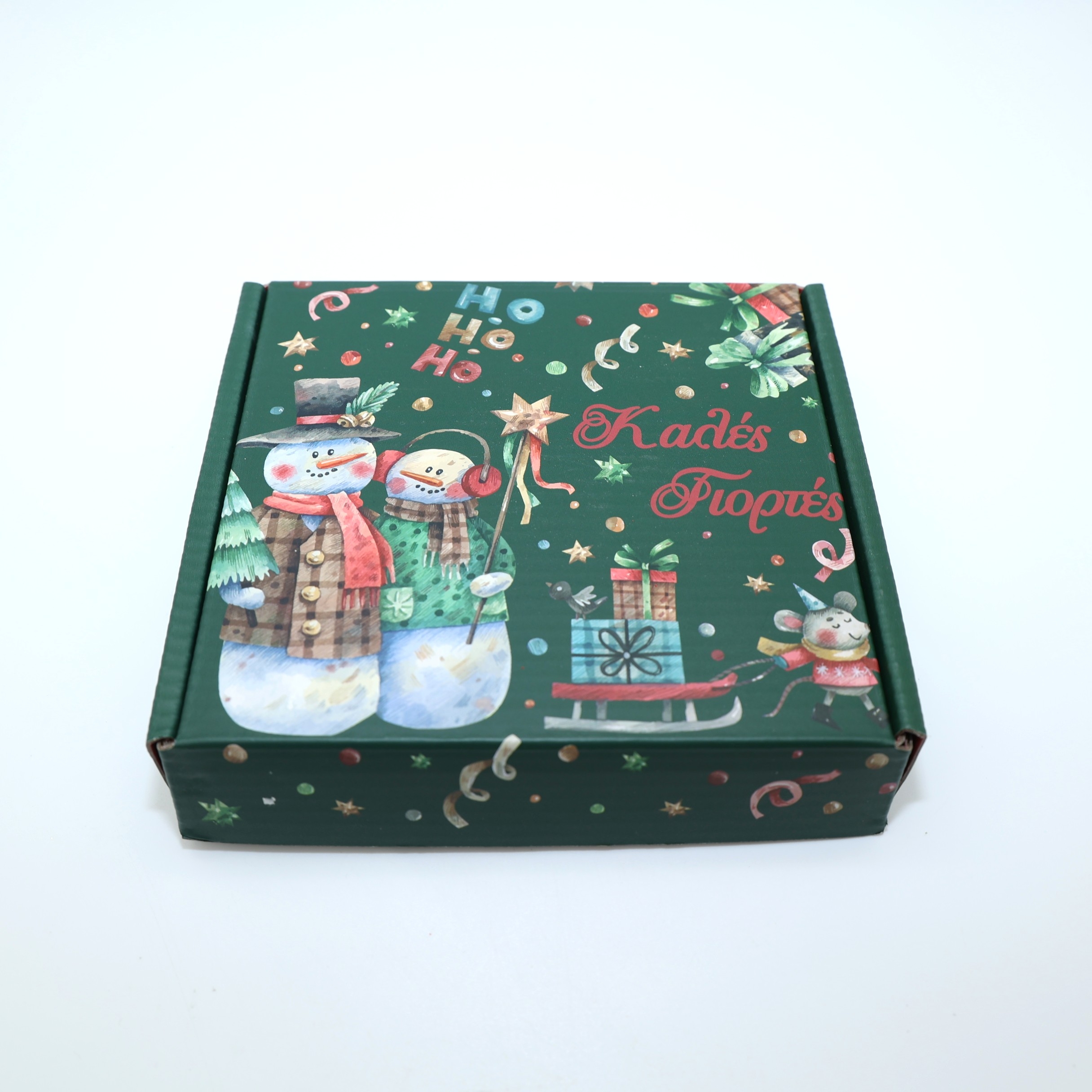 Χαρούμενο και γιορτινό χριστουγεννιάτικο κουτάκι για δώρο, με όμορφη εικονογράφηση από χιονάνθρωπους, αστέρια, κορδέλες και την επιγραφή Ho Ho Ho. Ο συνδυασμός πράσινου και κόκκινου χρώματος προσδίδει κλασικό χριστουγεννιάτικο ύφος.