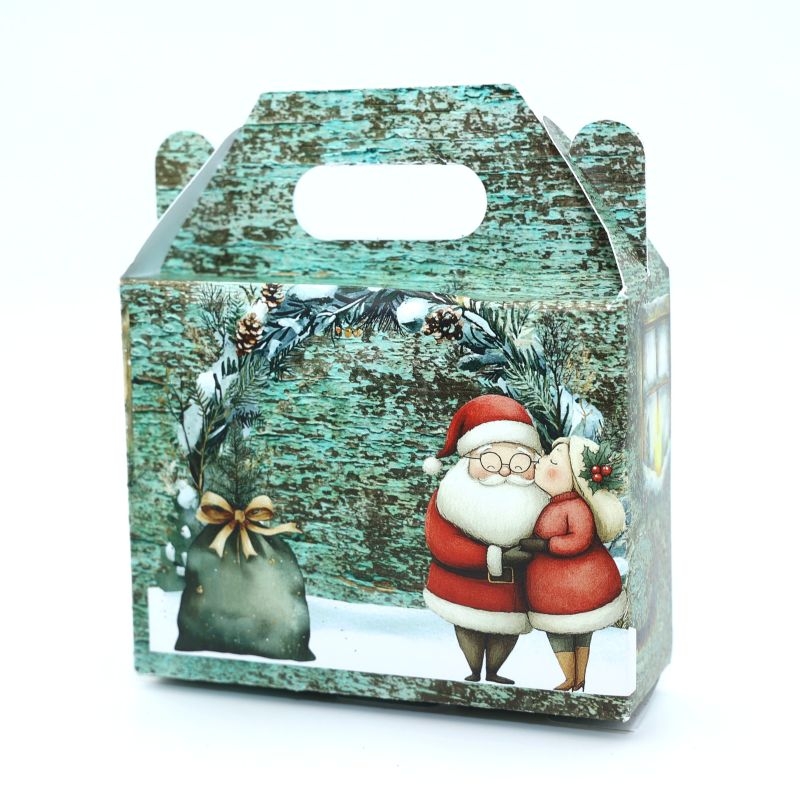 Γιορτινό χριστουγεννιάτικο κουτάκι δώρου με χαριτωμένο σχέδιο Άγιου Βασίλη και της γυναίκας του, χριστουγεννιάτικο δέντρο και χειμωνιάτικο τοπίο. Η vintage αισθητική και τα ζεστά χρώματα το καθιστούν ιδανικό για να χαρίσει χριστουγεννιάτικη μαγεία σε κάθε δώρο.