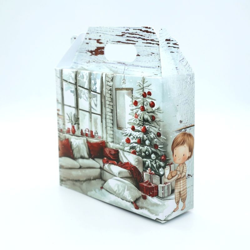 Γιορτινό χριστουγεννιάτικο κουτάκι δώρου με χαριτωμένο σχέδιο Άγιου Βασίλη, χριστουγεννιάτικο δέντρο και χειμωνιάτικο τοπίο και από την πίσω πλευρά ένα παιδάκι στο χριστουγεννιάτικο δέντρο. Η vintage αισθητική και τα ζεστά χρώματα το καθιστούν ιδανικό για να χαρίσει χριστουγεννιάτικη μαγεία σε κάθε δώρο.