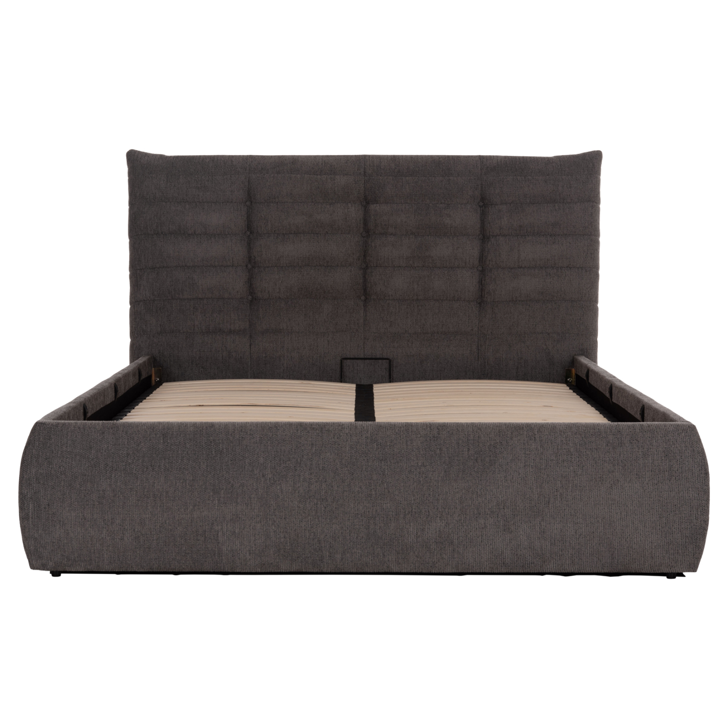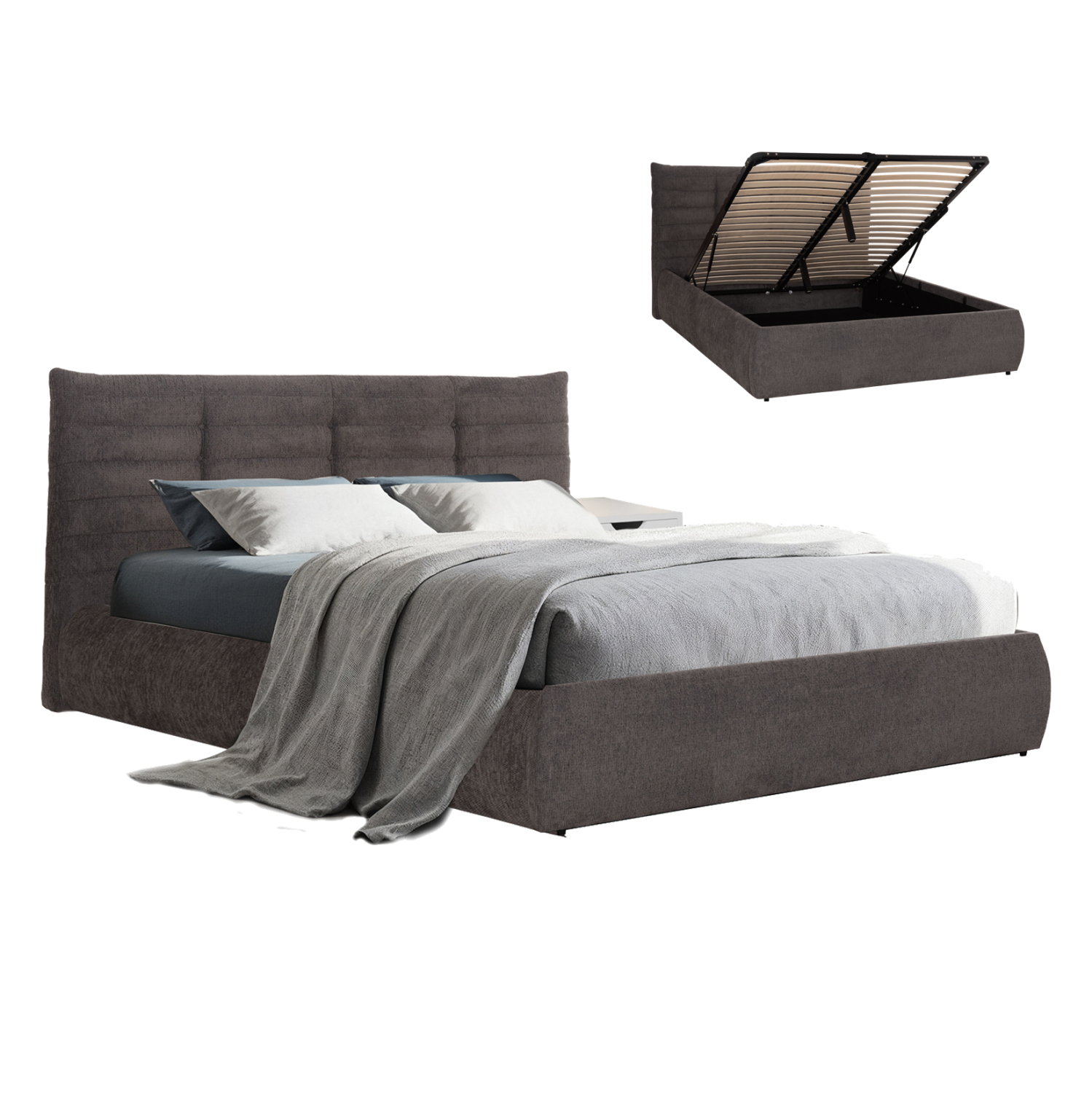 Το στρώμα στηρίζεται σε 20 σειρές εργονομικές τάβλες στήριξης, οι οποίες τοποθετούνται σε ένα μεταλλικό πλαίσιο που ανασηκώνεται με μηχανισμό ασφαλείας, προσφέροντας έναν μεγάλο αποθηκευτικό χώρο επενδυμένο επίσης με ύφασμα. Μια μοντέρνα πρόταση που θα ανανεώσει το υπνοδωμάτιό σας.