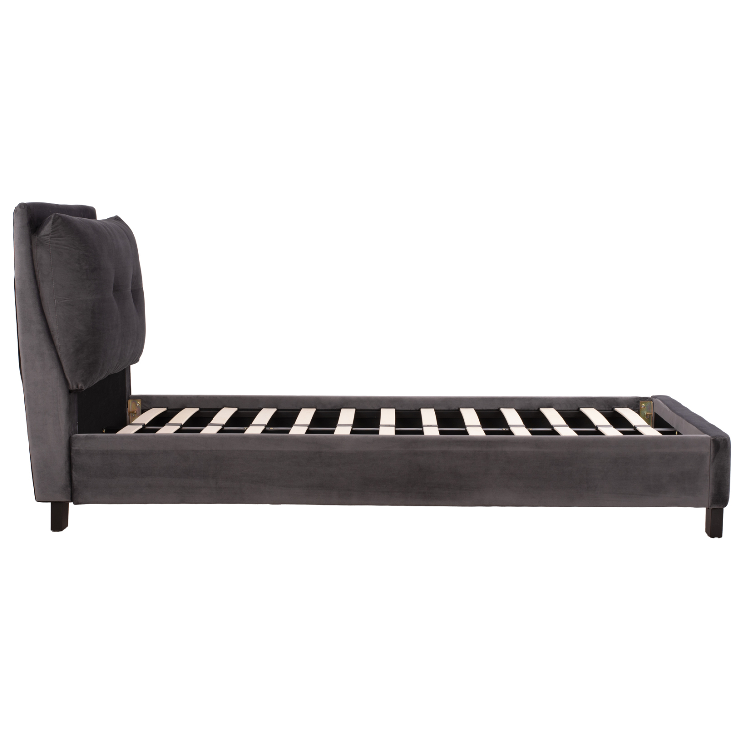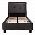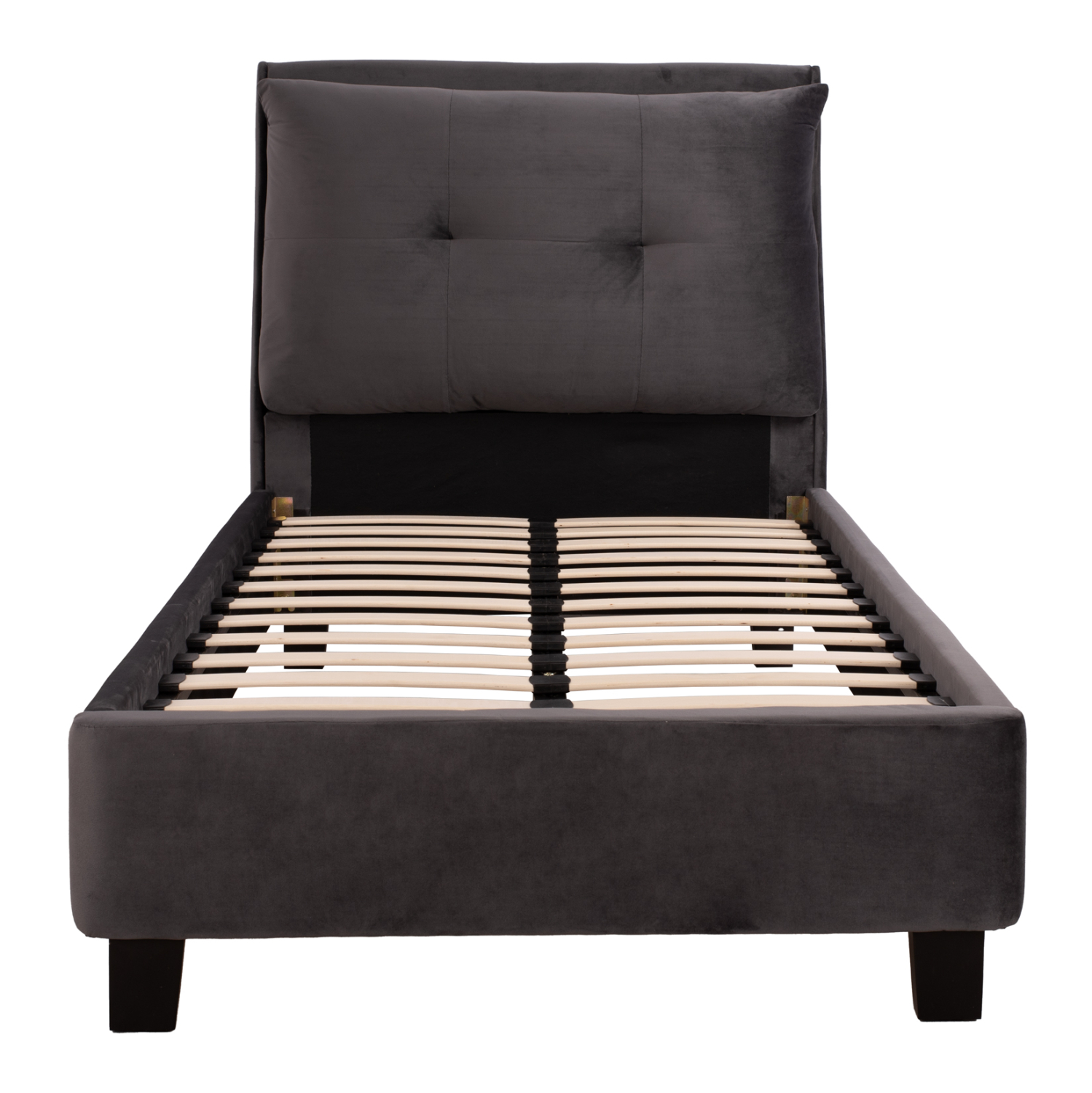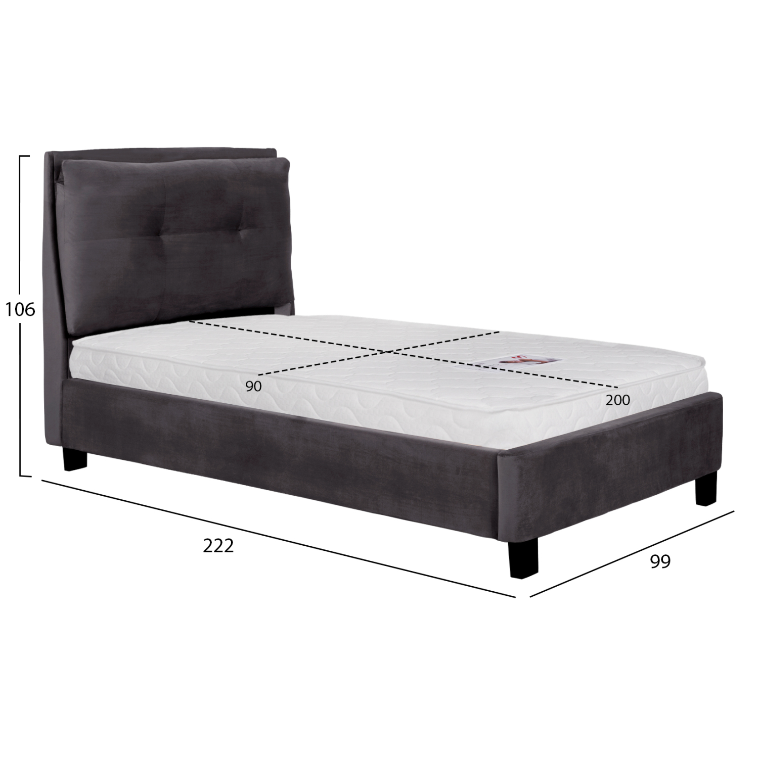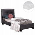 Το μονό κρεβάτι FB921282.01 είναι επενδυμένο με βελούδο σε ΓΚΡΙ χρώμα. Το στρώμα (διατίθεται σε ROLL-PACKING*) που συνοδεύει το κρεβάτι τοποθετείται σε δύο σειρές ανατομικές τάβλες, είναι διπλής όψης και είναι ΑΦΡΟΥ χωρίς ελατήρια. Τα πόδια είναι σχετικά ψηλά από πολυπροπυλένιο σε μαύρο χρώμα.