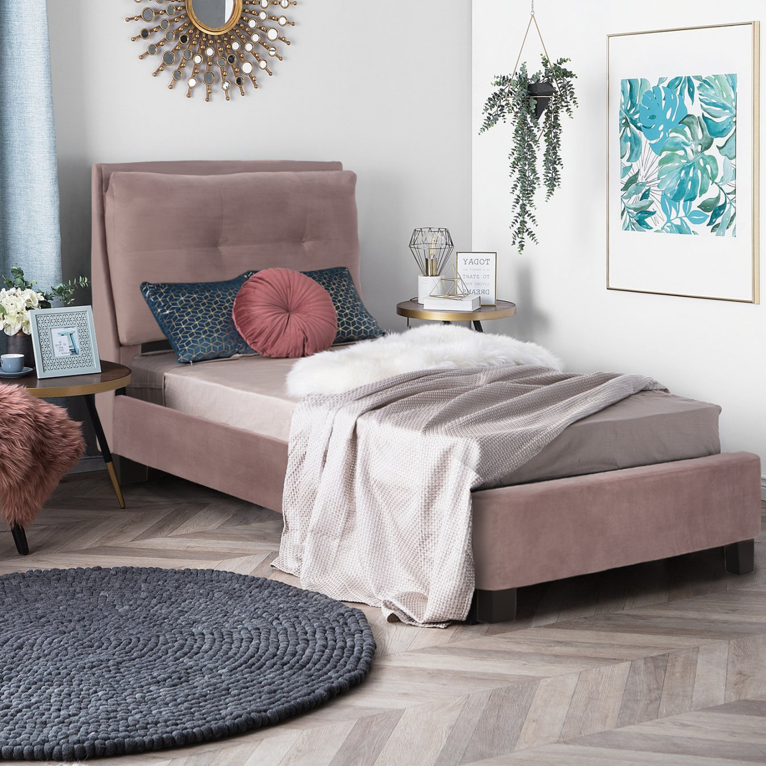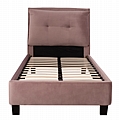 Το μονό κρεβάτι FB921282.02 είναι επενδυμένο με βελούδο σε ΣΑΠΙΟ ΜΗΛΟ χρώμα. Το στρώμα (διατίθεται σε ROLL-PACKING*) που συνοδεύει το κρεβάτι τοποθετείται σε δύο σειρές ανατομικές τάβλες, είναι διπλής όψης και είναι ΑΦΡΟΥ χωρίς ελατήρια. Τα πόδια είναι σχετικά ψηλά από πολυπροπυλένιο σε μαύρο χρώμα.