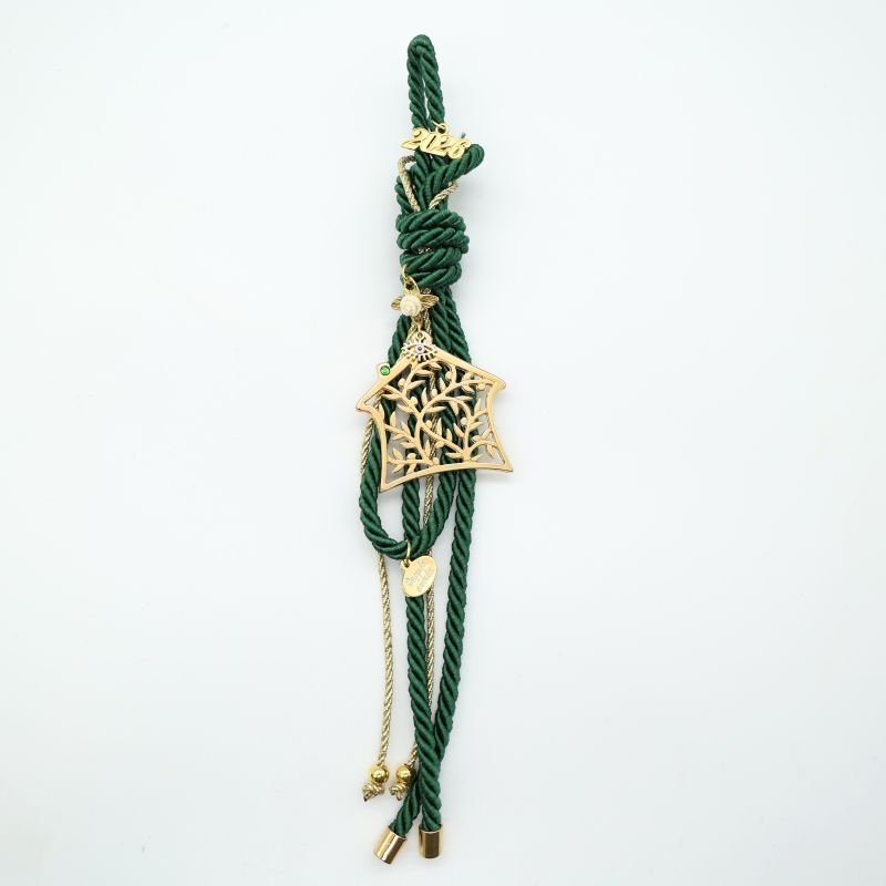 Εντυπωσιακό γούρι 2026 με μεταλλικό στοιχείο Δέντρο της Ζωής σε χρυσή απόχρωση, δεμένο σε κομψό πράσινο στριφτό κορδόνι. Το Δέντρο της Ζωής συμβολίζει δύναμη, ανάπτυξη και θετική ενέργεια, καθιστώντας το ιδανικό φυλαχτό για τη νέα χρονιά.