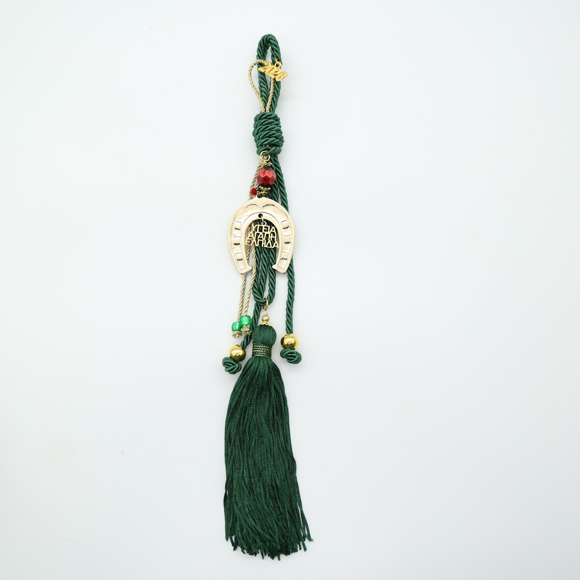 Κομψό γούρι σε πράσινη απόχρωση με χρυσό μεταλλικό πέταλο, σύμβολο τύχης και προστασίας για τη νέα χρονιά. Διακοσμείται με τρεις κρεμαστές λέξεις – Υγεία, Αγάπη, Ελπίδα – που εκφράζουν τις πιο όμορφες ευχές για το νέο έτος.