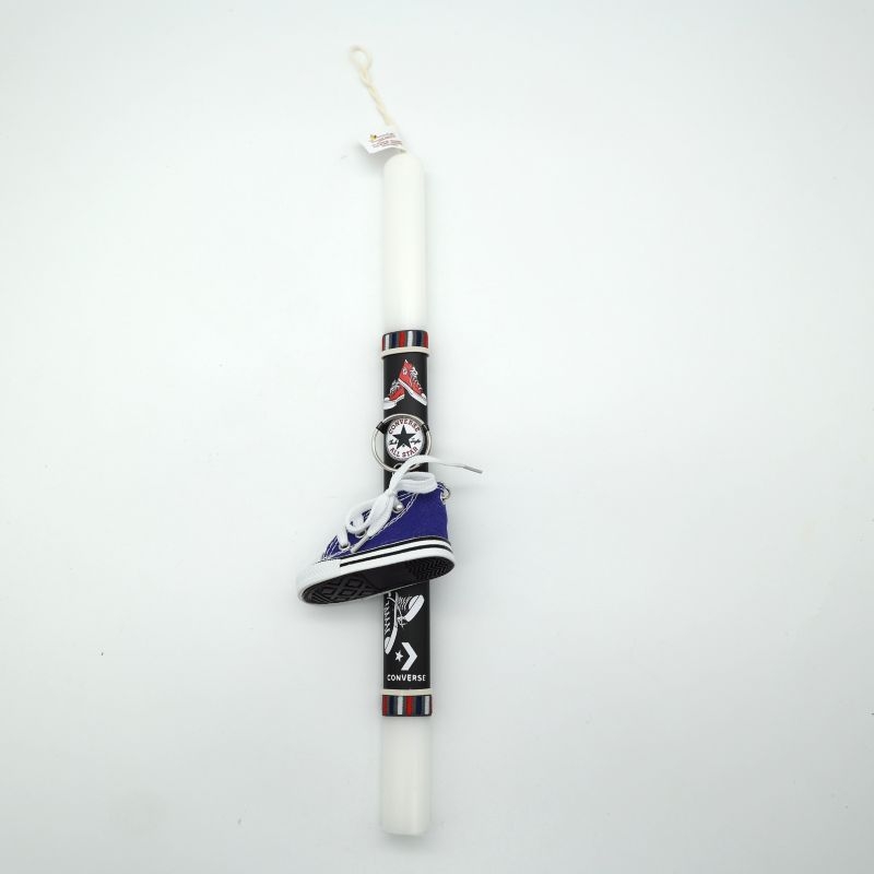 Πασχαλινή λαμπάδα διακοσμημένη με μπρελόκ σε σχέδιο μπλε σταρακίου τύπου Converse All Star. Ένα μοντέρνο και νεανικό σχέδιο που ξεχωρίζει και ταιριάζει ιδιαίτερα σε όσους αγαπούν το casual και αθλητικό στυλ.