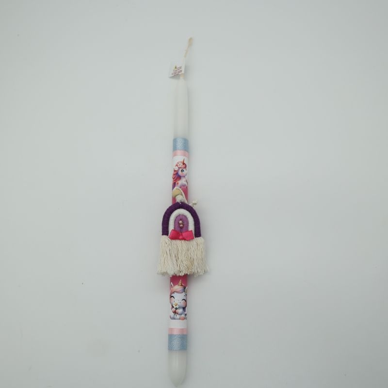 Χειροποίητη πασχαλινή λαμπάδα σε όμορφες ροζ, μωβ και μπλε αποχρώσεις, διακοσμημένη με χαριτωμένο πόνυ και κρεμαστό ουράνιο τόξο με φούντα. Τα ζωηρά χρώματα και τα παιχνιδιάρικα διακοσμητικά δημιουργούν μια χαρούμενη και παραμυθένια ατμόσφαιρα.