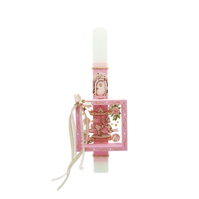 Λαμπάδα με Ξύλινο Καδράκι Καρουζέλ – Ροζ 30cm