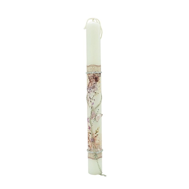 Όμορφη λαμπάδα διακοσμημένη με κρεμαστό κολιέ σε σχήμα πεταλούδας σε λιλά απόχρωση. Η πεταλούδα συμβολίζει την ομορφιά και την ανανέωση, ενώ το απαλό λιλά χρώμα δίνει μια ρομαντική και χαρούμενη πινελιά.