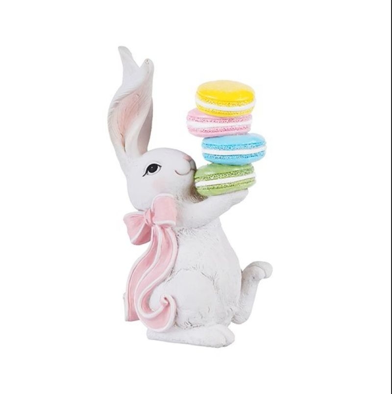 Χαριτωμένο πασχαλινό διακοσμητικό λαγουδάκι από πολυρεζίν σε λευκή απόχρωση, διακοσμημένο με κομψό φιόγκο και πολύχρωμα μακαρόν που προσθέτουν μια παιχνιδιάρικη και γλυκιά πινελιά. Ο συνδυασμός των απαλών χρωμάτων με τα ζωηρά στοιχεία δημιουργεί ένα χαρούμενο και ανοιξιάτικο αποτέλεσμα.