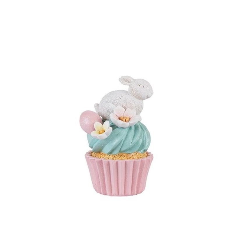 Χαριτωμένο πασχαλινό διακοσμητικό λαγουδάκι από πολυρεζίν σε λευκή απόχρωση, τοποθετημένο πάνω σε διακοσμητικό “κέικ”, με όμορφα λουλούδια και ροζ αυγό. Ο γλυκός και παιχνιδιάρικος σχεδιασμός του δημιουργεί μια χαρούμενη και ανοιξιάτικη εικόνα.