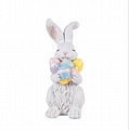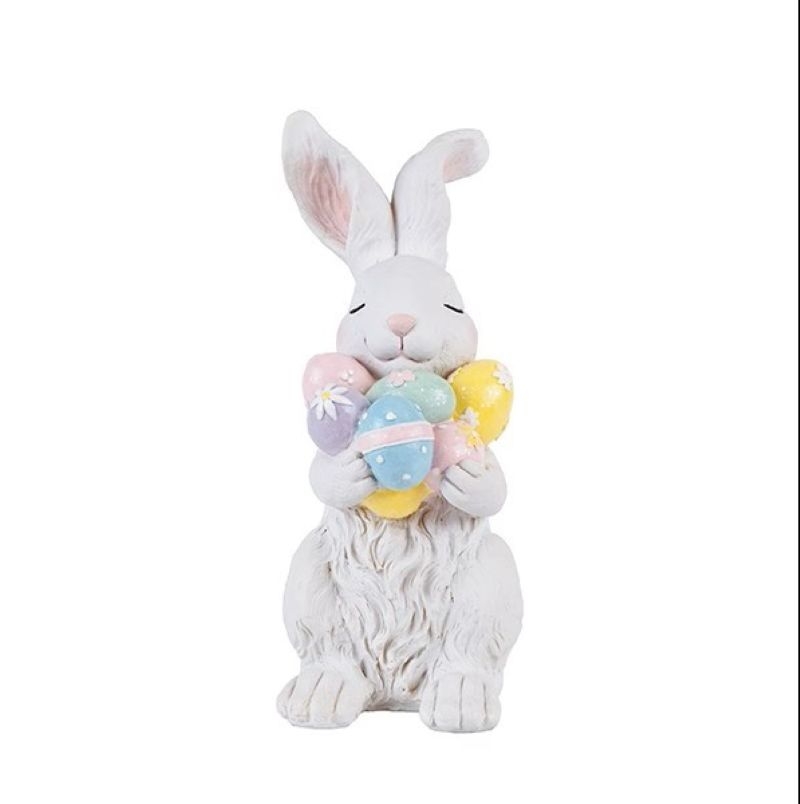 Εντυπωσιακό πασχαλινό διακοσμητικό λαγουδάκι από πολυρεζίν σε λευκές και ροζ αποχρώσεις, διακοσμημένο με πολύχρωμα πασχαλινά αυγά που χαρίζουν μια γλυκιά και παιχνιδιάρικη διάθεση. Ο ιδιαίτερος σχεδιασμός του συνδυάζει κομψότητα και χαρούμενα χρώματα, δημιουργώντας ένα ξεχωριστό αποτέλεσμα.