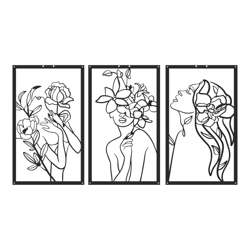 Ανανεώστε την αισθητική του χώρου σας με το σετ Witho. Τρία παραλληλόγραμμα μεταλλικά κάδρα που απεικονίζουν τη γυναικεία σιλουέτα να «ανθίζει», με λουλούδια να μπλέκονται αρμονικά στα μαλλιά και το σώμα. Είναι μια ωδή στην εσωτερική ομορφιά και την αυτοπεποίθηση.
