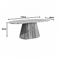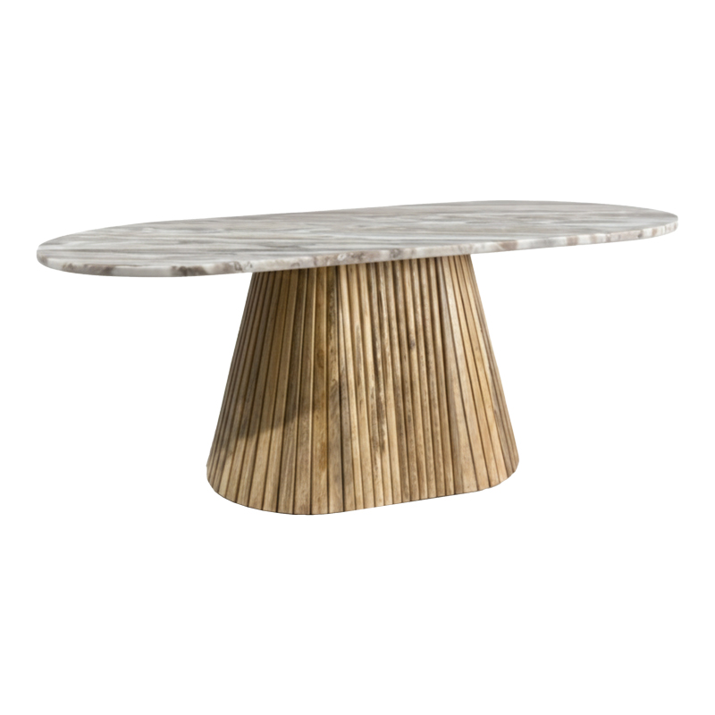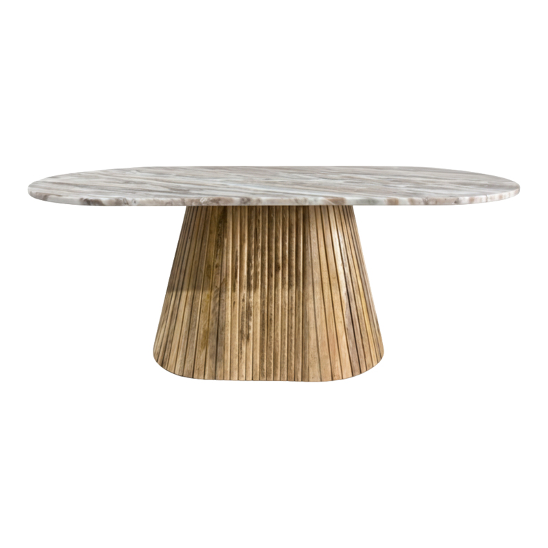 Η βάση του τραπεζιού είναι κατασκευασμένη από μασίφ Ξύλο Μάνγκο, με ενα ιδιαίτερο χαρακτηριστικό την ανάγλυφη, ραβδωτή υφή της, η οποία δημιουργεί ένα εντυπωσιακό οπτικό ενδιαφέρον και μια ζεστή, σύγχρονη αίσθηση.