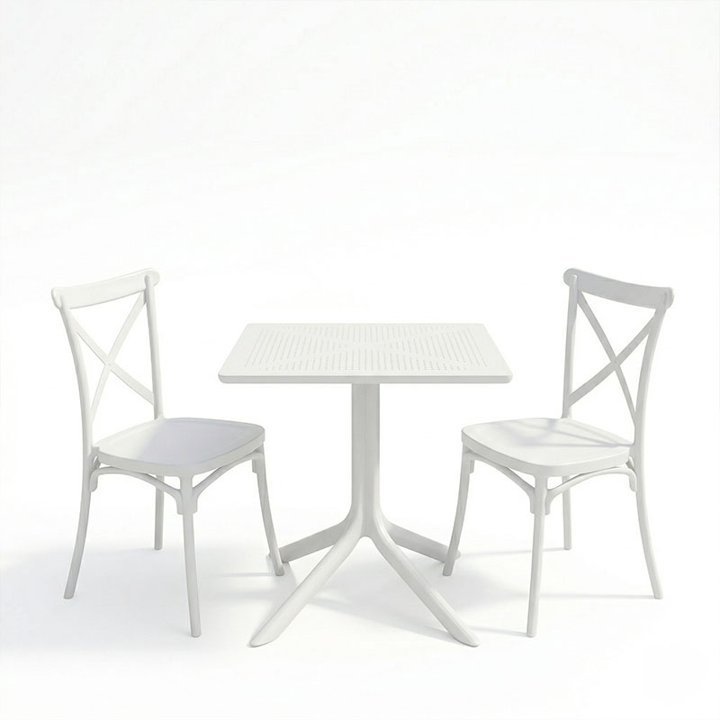 Η παράδοση συναντά το σήμερα. Το σετ παντρεύει την κλασική "χιαστί" πλάτη της καρέκλας Crossie με τον industrial διάτρητο σχεδιασμό του τραπεζιού Groovy. Ένα total white σύνολο που μεταμορφώνει το μπαλκόνι ή τον κήπο σας σε ένα γραφικό bistro, προσφέροντας απόλυτη αντοχή στις καιρικές συνθήκες.
