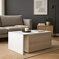 Tο μοντέρνο και λειτουργικό τραπεζάκι σαλονιού Extera αποτελεί μια κομψή προσθήκη σε κάθε σύγχρονο σπίτι. Ο συνδυασμός του λευκού χρώματος με τις ξύλινες λεπτομέρειες δημιουργεί μια αίσθηση ζεστασιάς και φωτεινότητας στον χώρο, ενώ ο έξυπνος σχεδιασμός του προσφέρει πρακτική αποθήκευση.