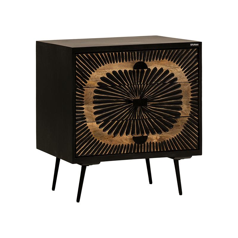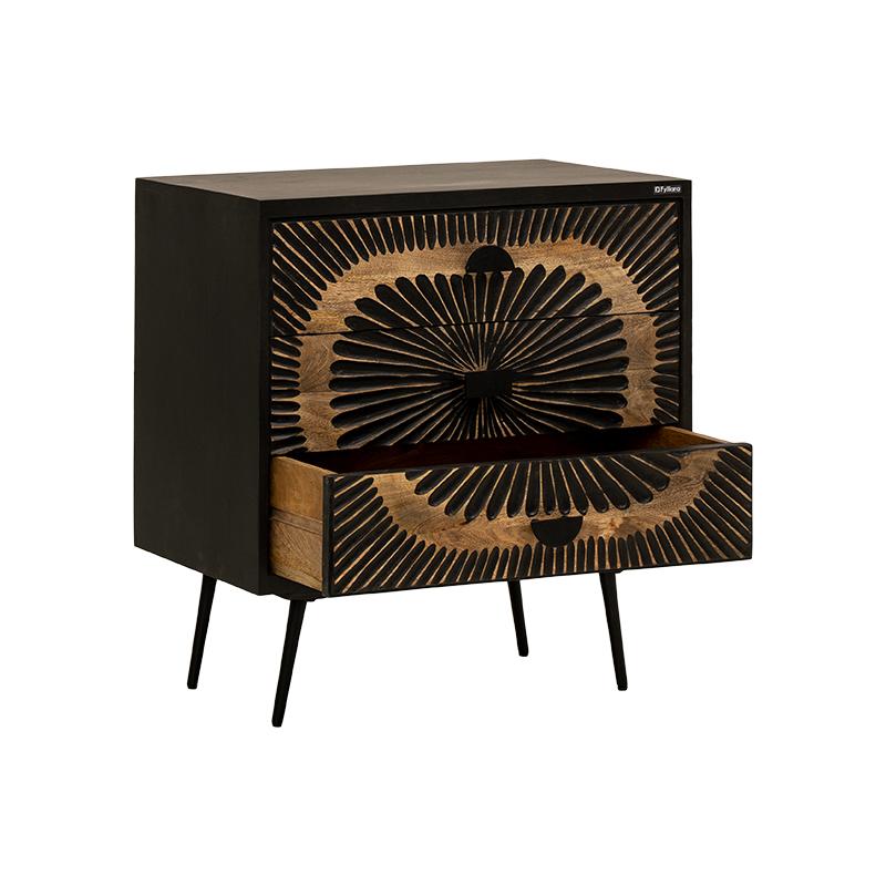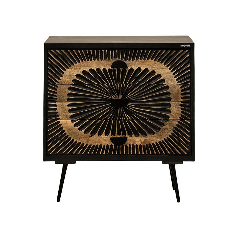 Η κομότα-συρταριέρα Fylliana Kanpur προσφέρει εξαιρετική συνδυαστική λειτουργικότητα και μοντέρνα αισθητική για το χώρο σας. Κατασκευασμένη από ξύλο mango wood με σιδερένια πόδια, αυτή η κομψή συρταριέρα διαθέτει το διακριτικό μαύρο με εφέ παλαίωσης χρώμα, προσφέροντας έναν ήσυχο και κομψό τόνο που ταιριάζει απόλυτα σε κάθε μοντέρνο ή βιομηχανικό χώρο.