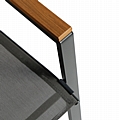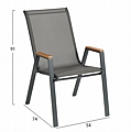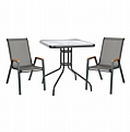 Αυτό το μικρό Σετ τραπεζαρίας εξωτερικού χώρου διαθέτει τετράγωνο τραπέζι με ΓΚΡΙ μεταλλικό σκελετό και γυάλινη (safety glass) θολή επιφάνεια, και 2 μεταλλικές πολυθρόνες με κάθισμα& πλάτη από textilene ύφασμα σε ΓΚΡΙ, με ξύλινη επένδυση στα μπράτσα.
