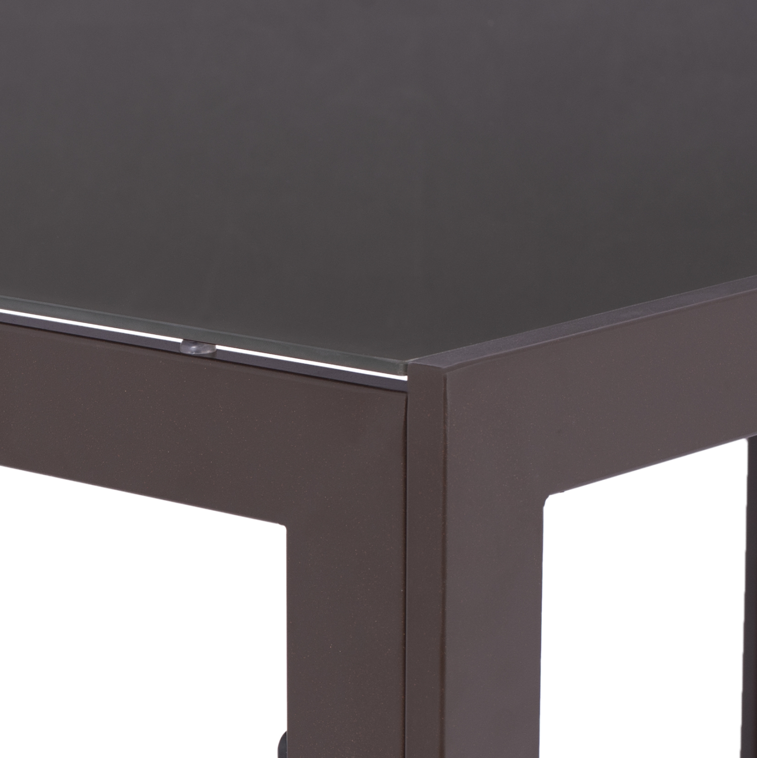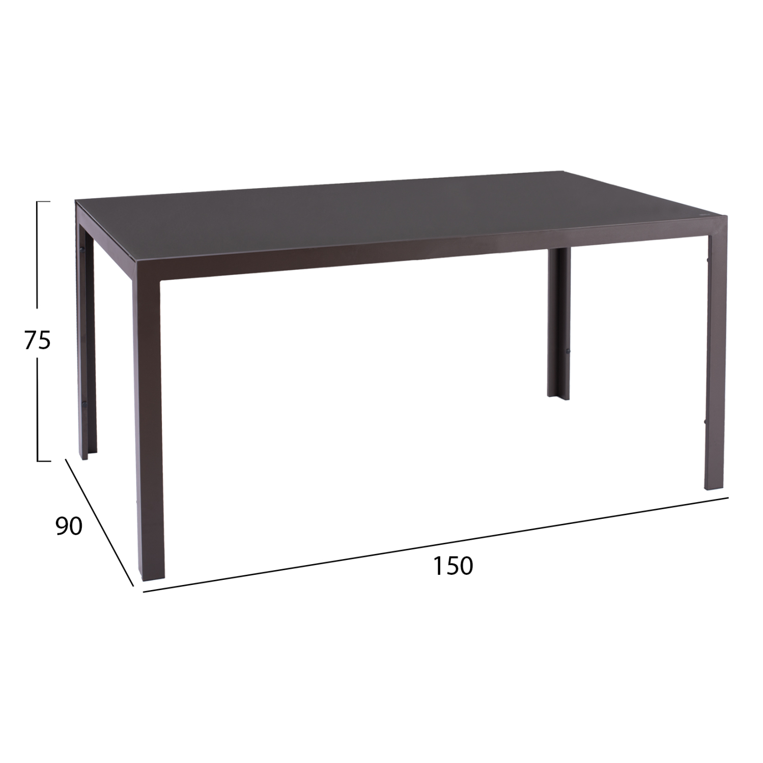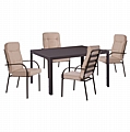 Αυτό το Σετ τραπεζαρίας εξωτερικού χώρου διαθέτει τραπέζι με μεταλλικό σκελετό και επιφάνεια σε χρώμα ΚΑΦΕ, ενώ η επιφάνεια διαθέτει γυαλί ασφαλείας, και 4 καφέ μεταλλικές πολυθρόνες με αναπαυτικό μαξιλάρι με επένδυση ΜΠΕΖ ύφασμα, με φερμουάρ. Το μαξιλάρι έχει πάχος 8εκ. και δένεται στην πολυθρόνα με διακριτικά κορδόνια.