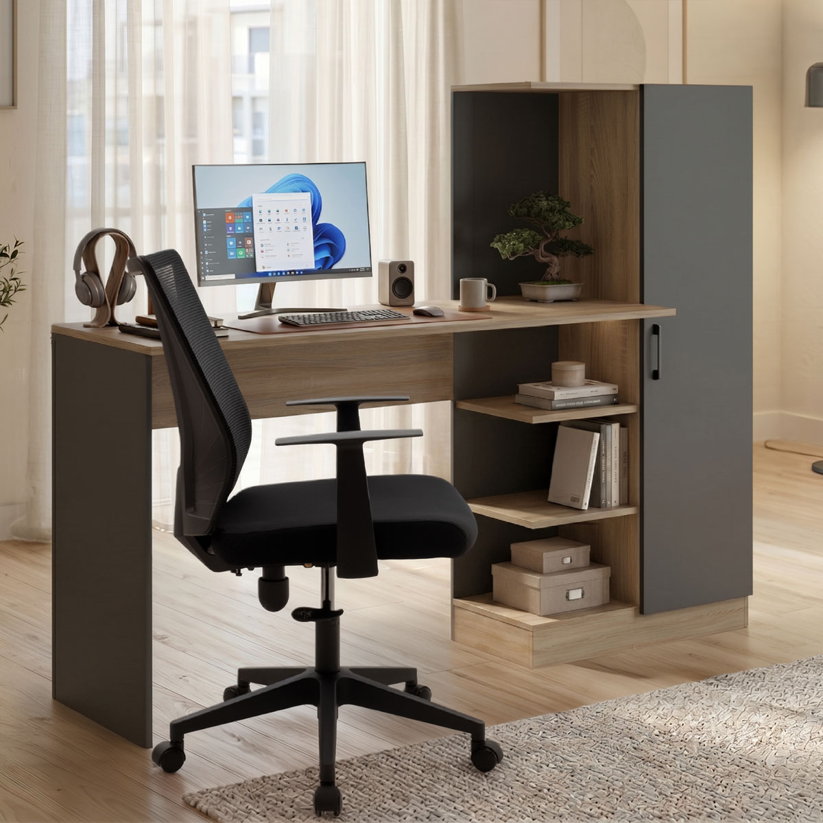 Γραφείο με βιβλιοθήκη και ντουλάπι Ofisio pakoworld sonoma-ανθρακί 152.3x40x120εκ