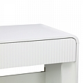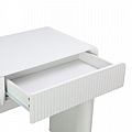 Το κύριο σχεδιαστικό στοιχείο είναι η ανάγλυφη υφή των δύο συρταριών, προσδίδοντας μια νότα luxe και οπτικού ενδιαφέροντος στην κατά τα άλλα μίνιμαλ επιφάνεια. Το λευκό φινίρισμα εξασφαλίζει τη μέγιστη προσαρμοστικότητα σε κάθε χρωματική παλέτα, ενώ τα δύο ευρύχωρα συρτάρια προσφέρουν διακριτική αποθήκευση.