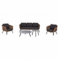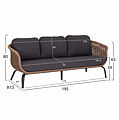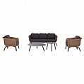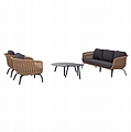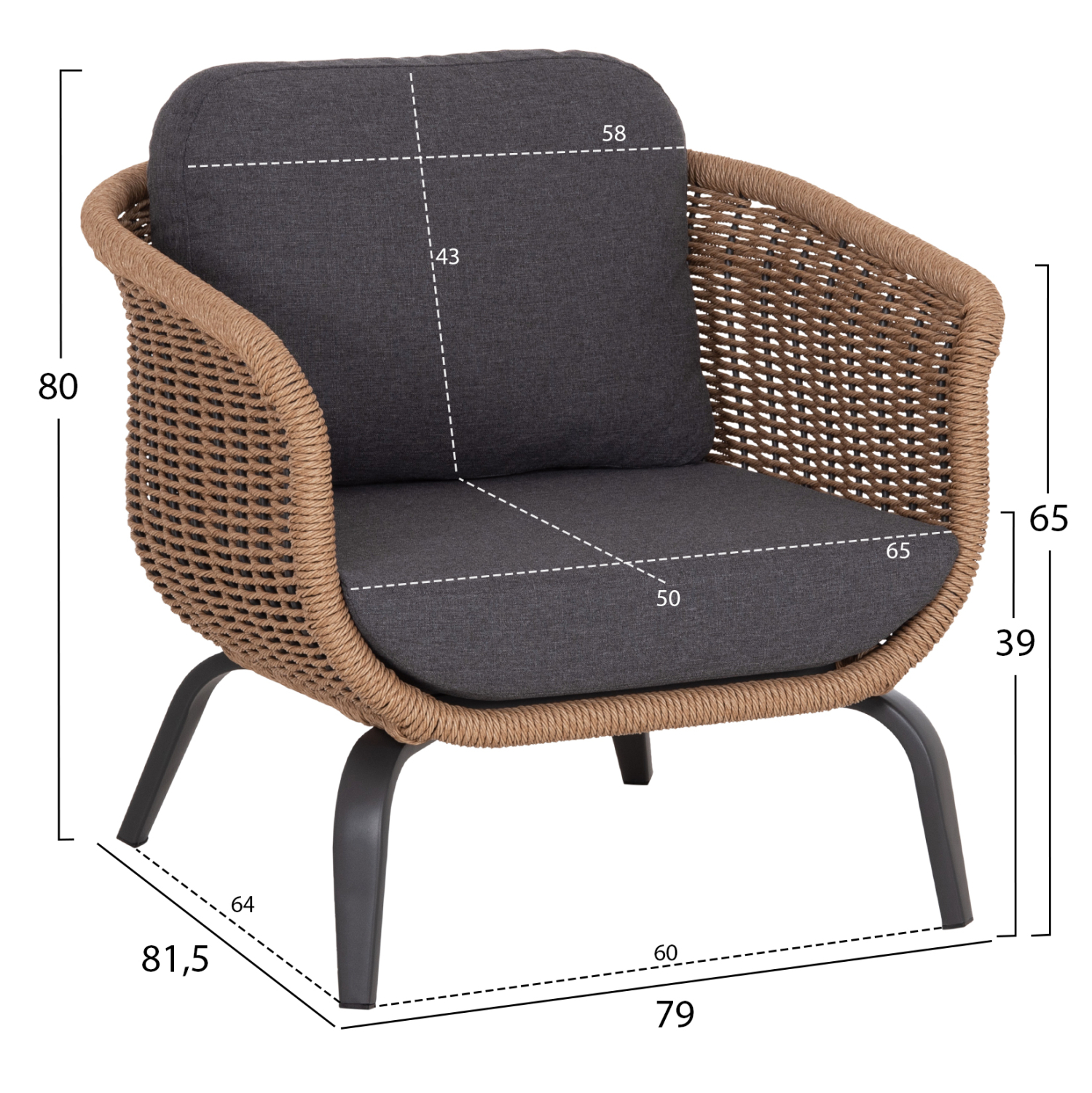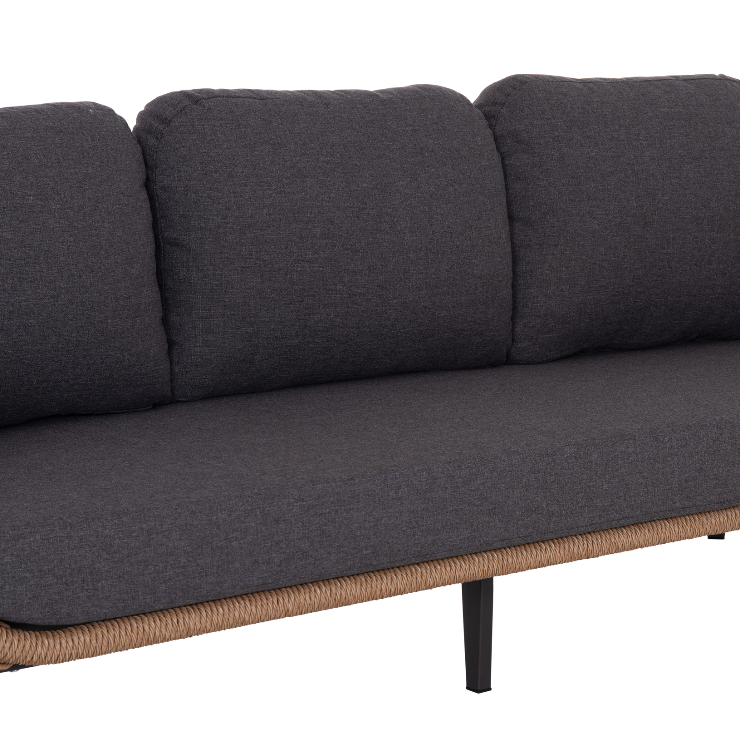 Ο σκελετός από αλουμίνιο σε γκρι απόχρωση, επενδυμένος με twist wicker σε φυσικό χρώμα, προσδίδει φυσική υφή και σύγχρονη κομψότητα. Ο 3-θέσιος καναπές και οι πολυθρόνες διαθέτουν άνετα μαξιλάρια με γκρι OLEFIN καλύμματα με φερμουάρ, προσφέροντας ξεκούραση και στήριξη.