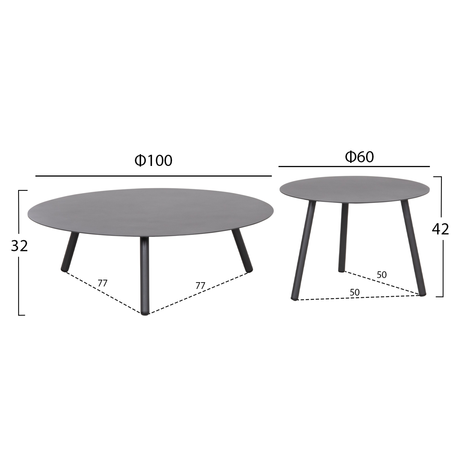 Μεγάλο τραπεζάκι: Φ100x32Υ εκ.---Απόσταση ποδιών: 77x77 εκ.
