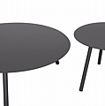 Τα δύο στρογγυλά τραπεζάκια με επιφάνειες αλουμινίου ολοκληρώνουν το σετ, προσθέτοντας πρακτικότητα και minimal αισθητική στον χώρο.