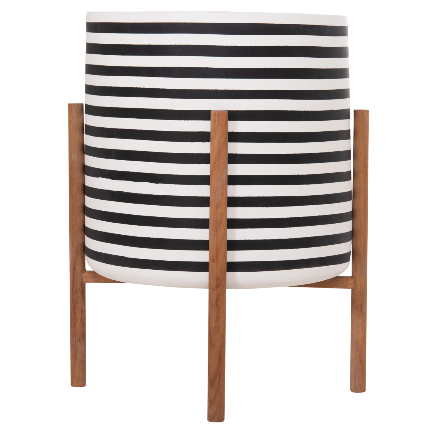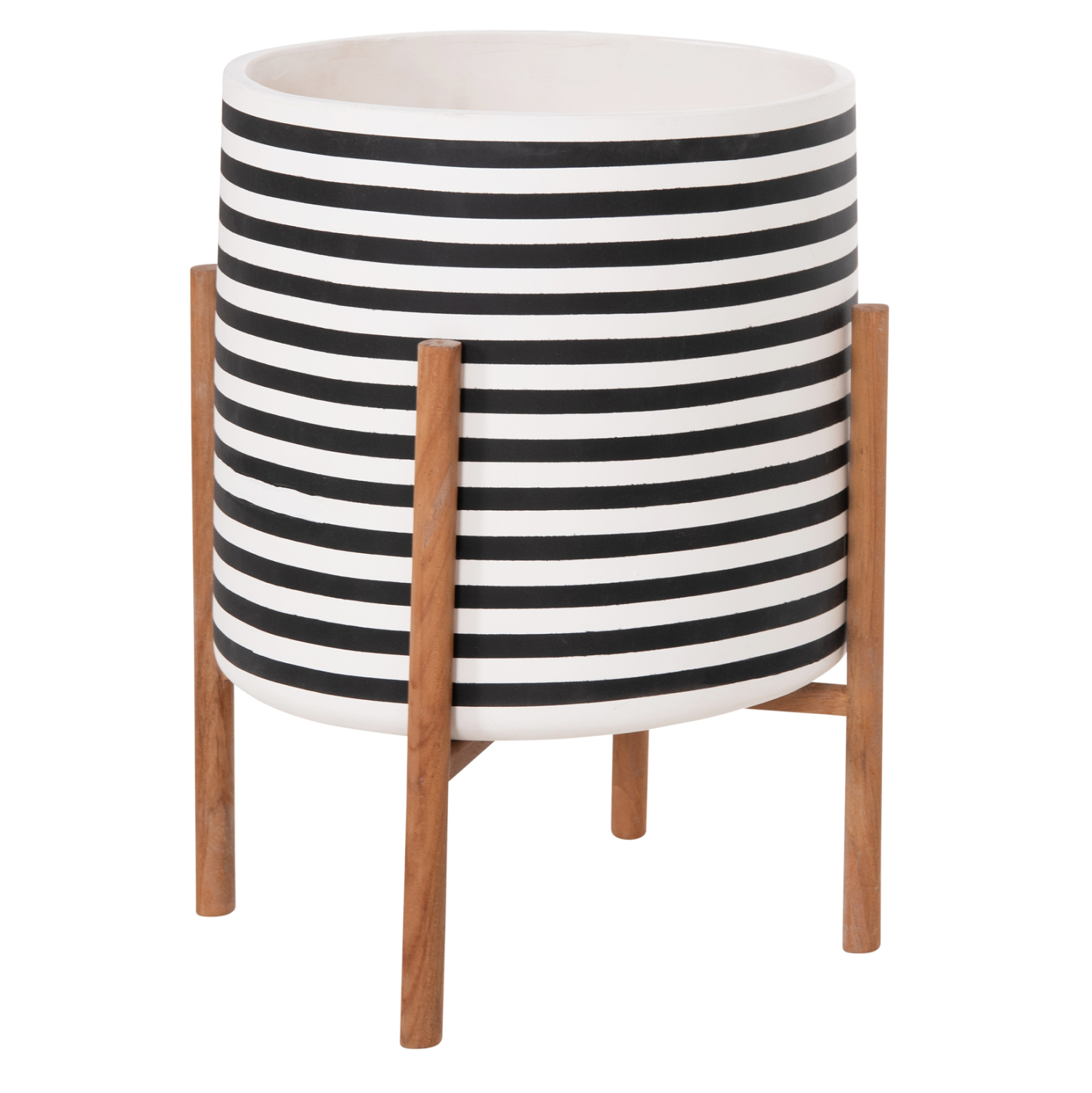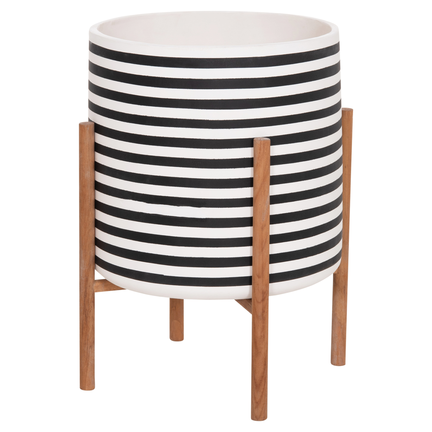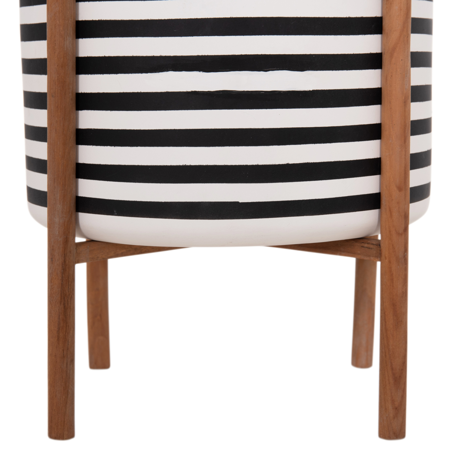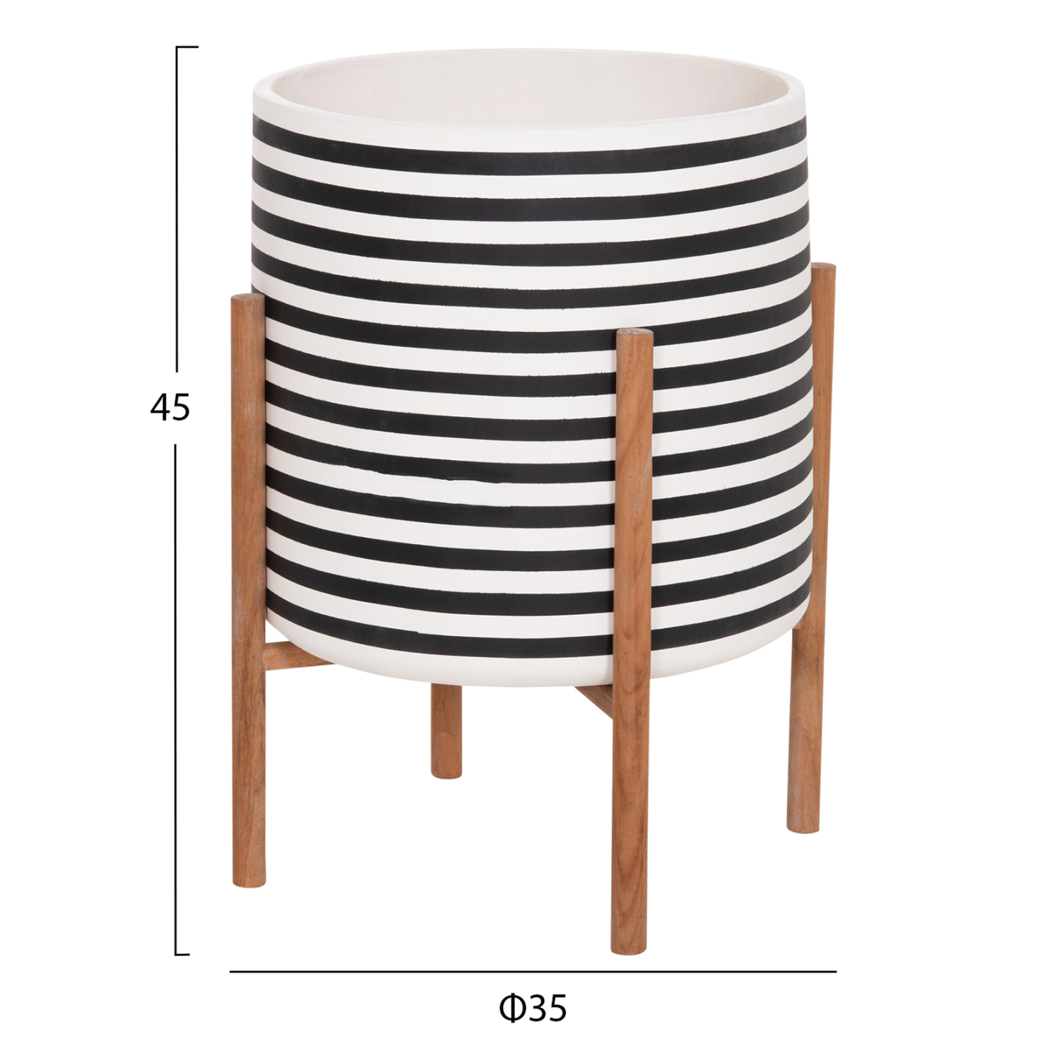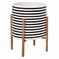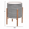 Η γλάστρα εσωτερικού χώρου (κασπό) FB94683L είναι κατασκευασμένη από Fiber Cement σε ΛΕΥΚΟ και ΜΑΥΡΟ χρώμα σε ρίγες. Το ιδιαίτερο χαρακτηριστικό της είναι ότι συνοδεύεται και τοποθετείται σε μια χιαστί βάση από ξύλο teak. Συνιστάται η τοποθέτηση εσωτερικού δοχείου εάν πρόκειται να την χρησιμοποιήσετε με νερό!