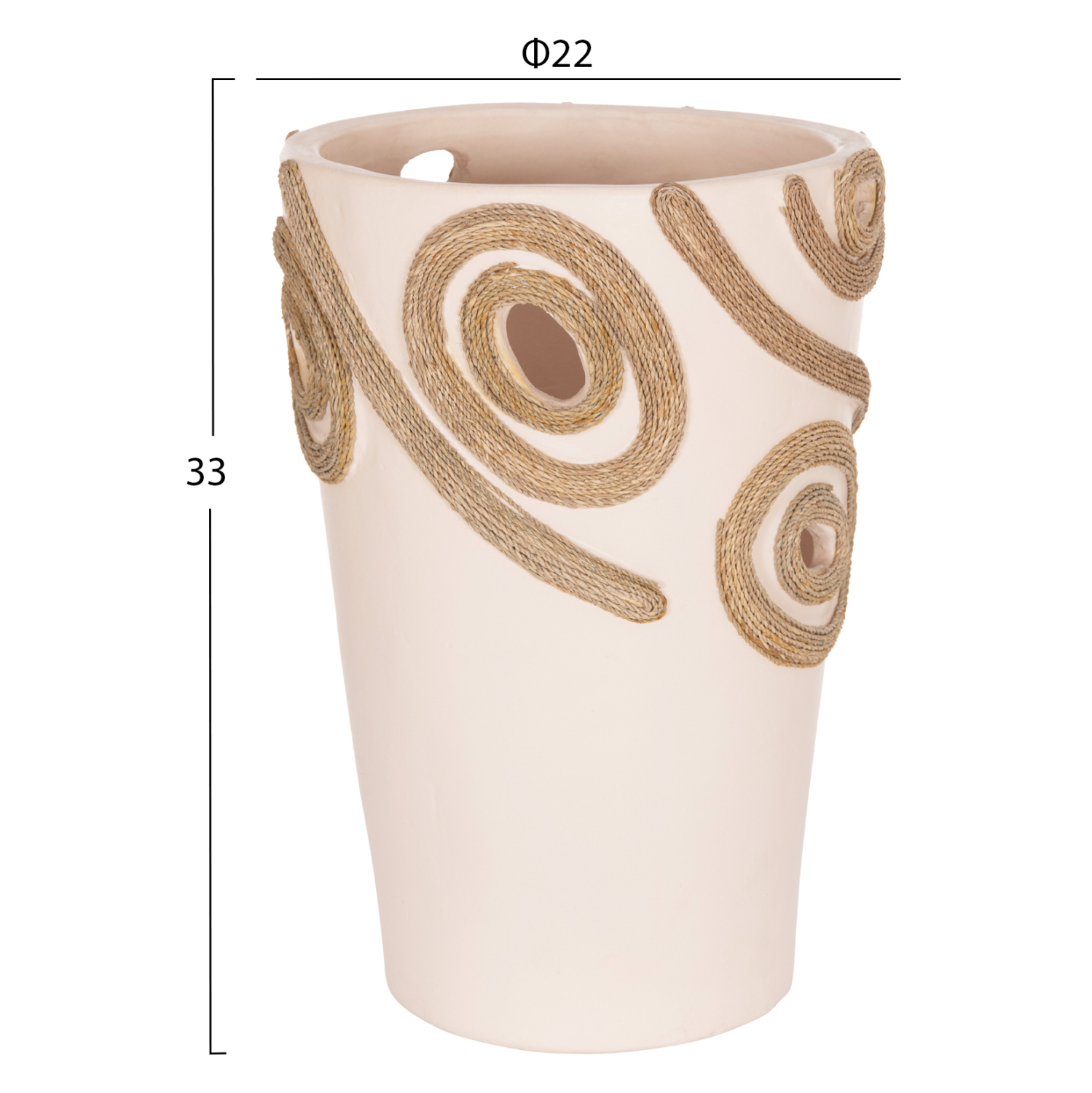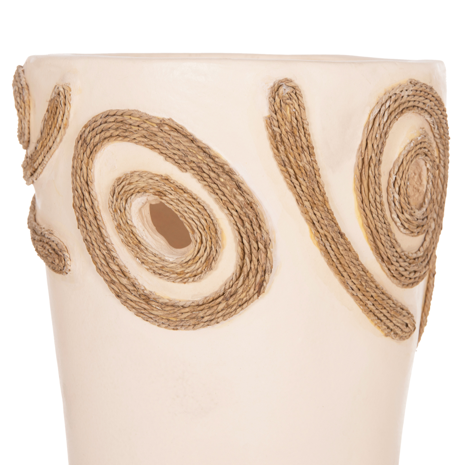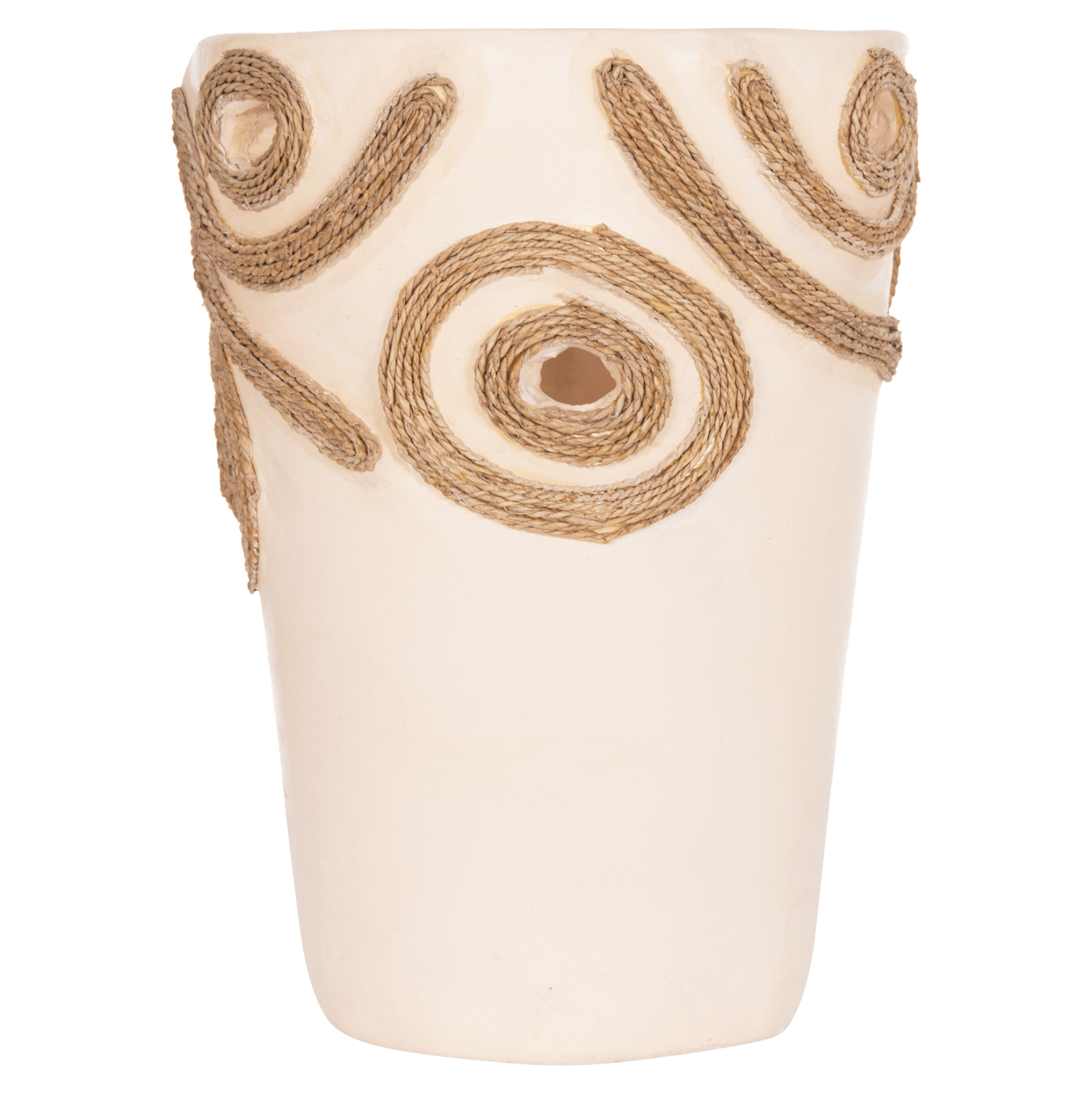 Το επιτραπέζιο χειροποίητο διακοσμητικό βάζο FB94677.02L είναι λιτό σε κλασσικό σχέδιο. Είναι κατασκευασμένο εξολοκλήρου από τερακότα σε ΚΡΕΜ χρώμα ενώ διαθέτει διακοσμητικά σχέδια με σχοινί από ίνες φοίνικα κολλημένο στις πλευρές του βάζου. Ιδανικό για πληθώρα χώρων, τόσο για το σπίτι, όσο και για επαγγελματικούς χώρους.