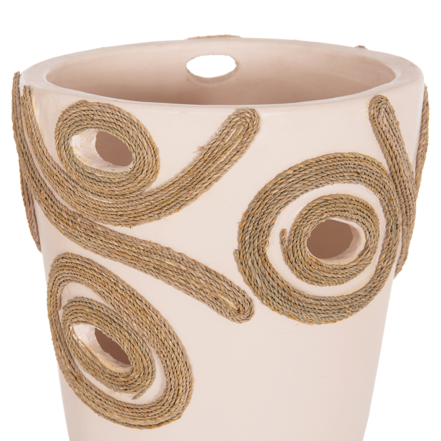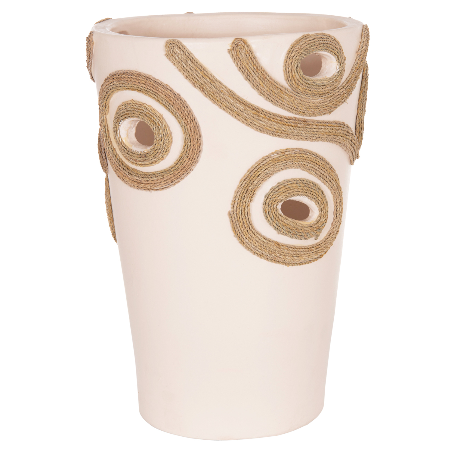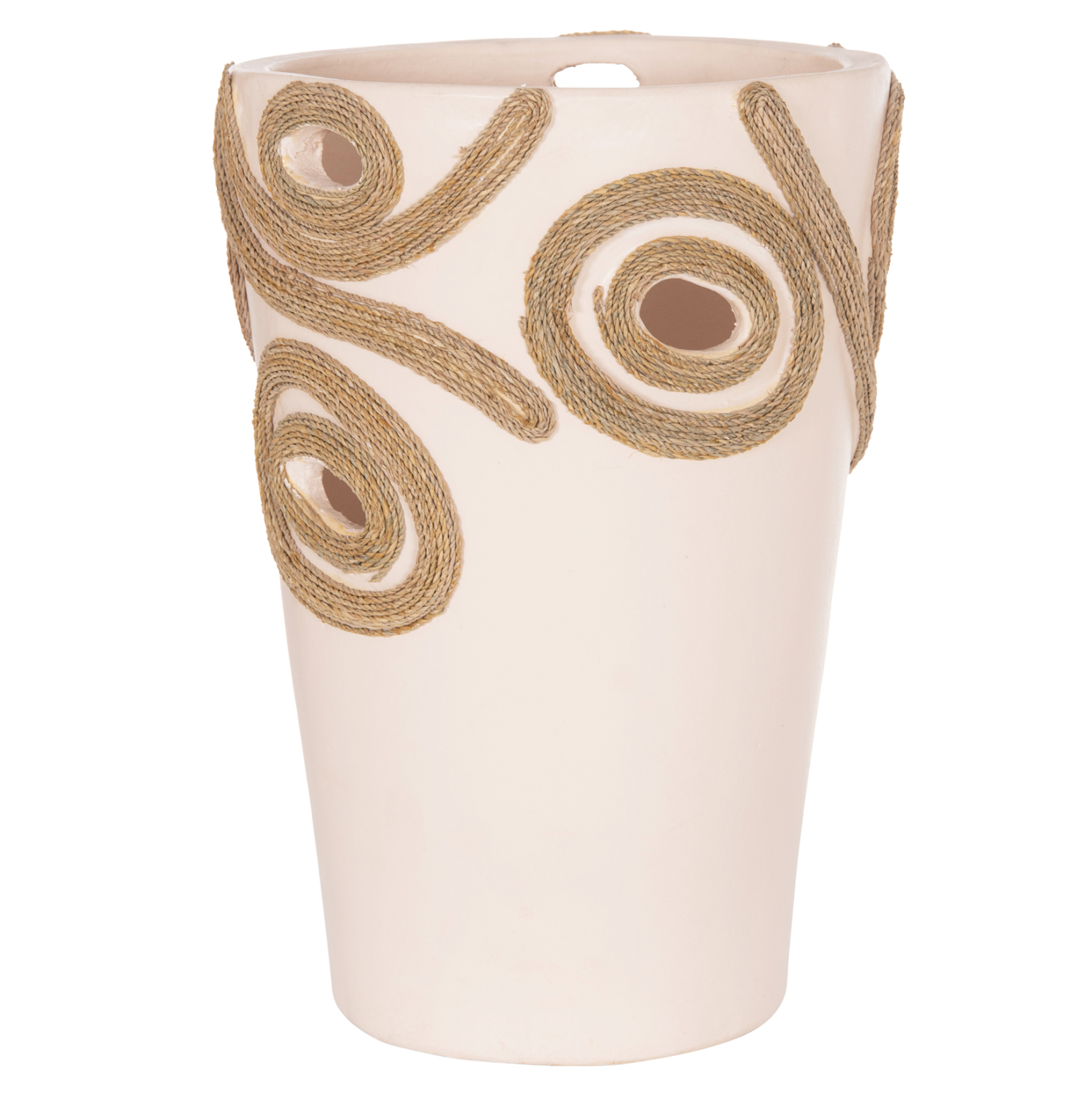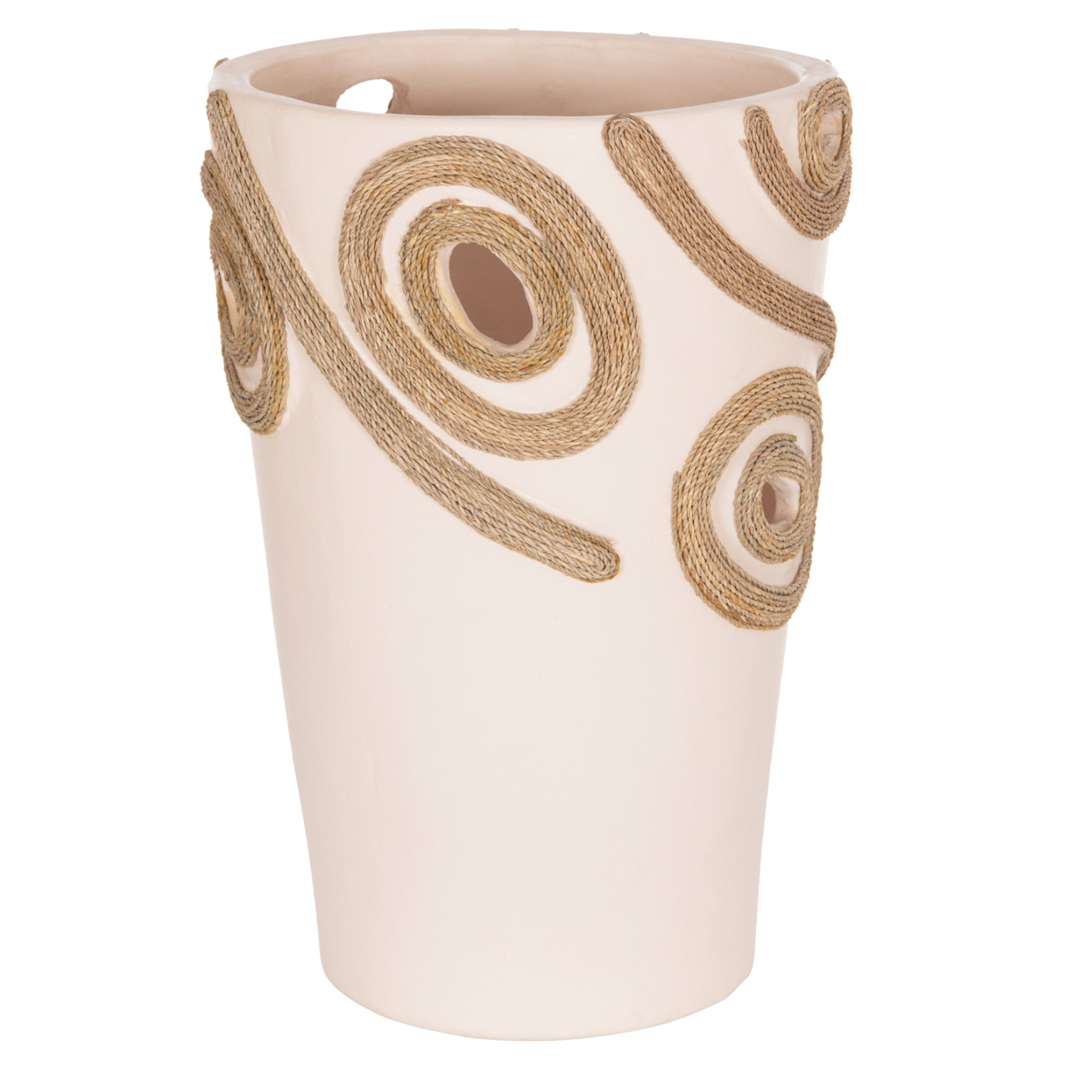 Το επιτραπέζιο χειροποίητο διακοσμητικό βάζο FB94677.02L είναι λιτό σε κλασσικό σχέδιο. Είναι κατασκευασμένο εξολοκλήρου από τερακότα σε ΚΡΕΜ χρώμα ενώ διαθέτει διακοσμητικά σχέδια με σχοινί από ίνες φοίνικα κολλημένο στις πλευρές του βάζου. Ιδανικό για πληθώρα χώρων, τόσο για το σπίτι, όσο και για επαγγελματικούς χώρους.