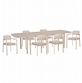 Ένα ορθογώνιο ΕΠΕΚΤΕΙΝΟΜΕΝΟ τραπέζι εξολοκλήρου από αλουμίνιο σε ΜΠΕΖ χρώμα, και 6 καρέκλες αλουμινίου σε ΜΠΕΖ με όμορφη minimal πλάτη και μαξιλάρι καθίσματος πάχους 3εκ με επένδυση από OLEFIN ύφασμα και αφρό γεμίσματος ποιότητας 25D για εξαιρετική αίσθηση κατά την χρήση, ενώ η λεπτομέρεια με το ξύλο teak στα μπράτσα ανεβάζει τον πήχυ της ποιότητας.