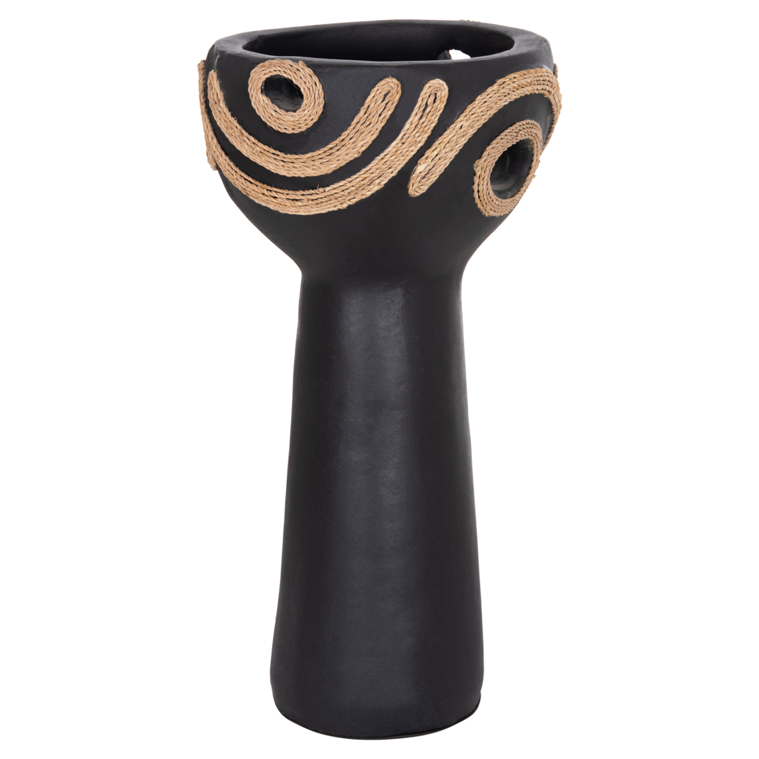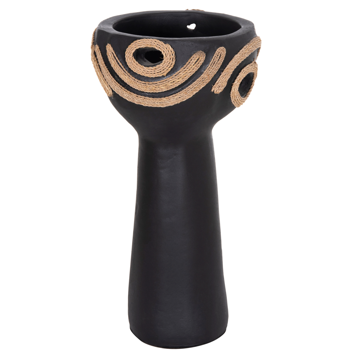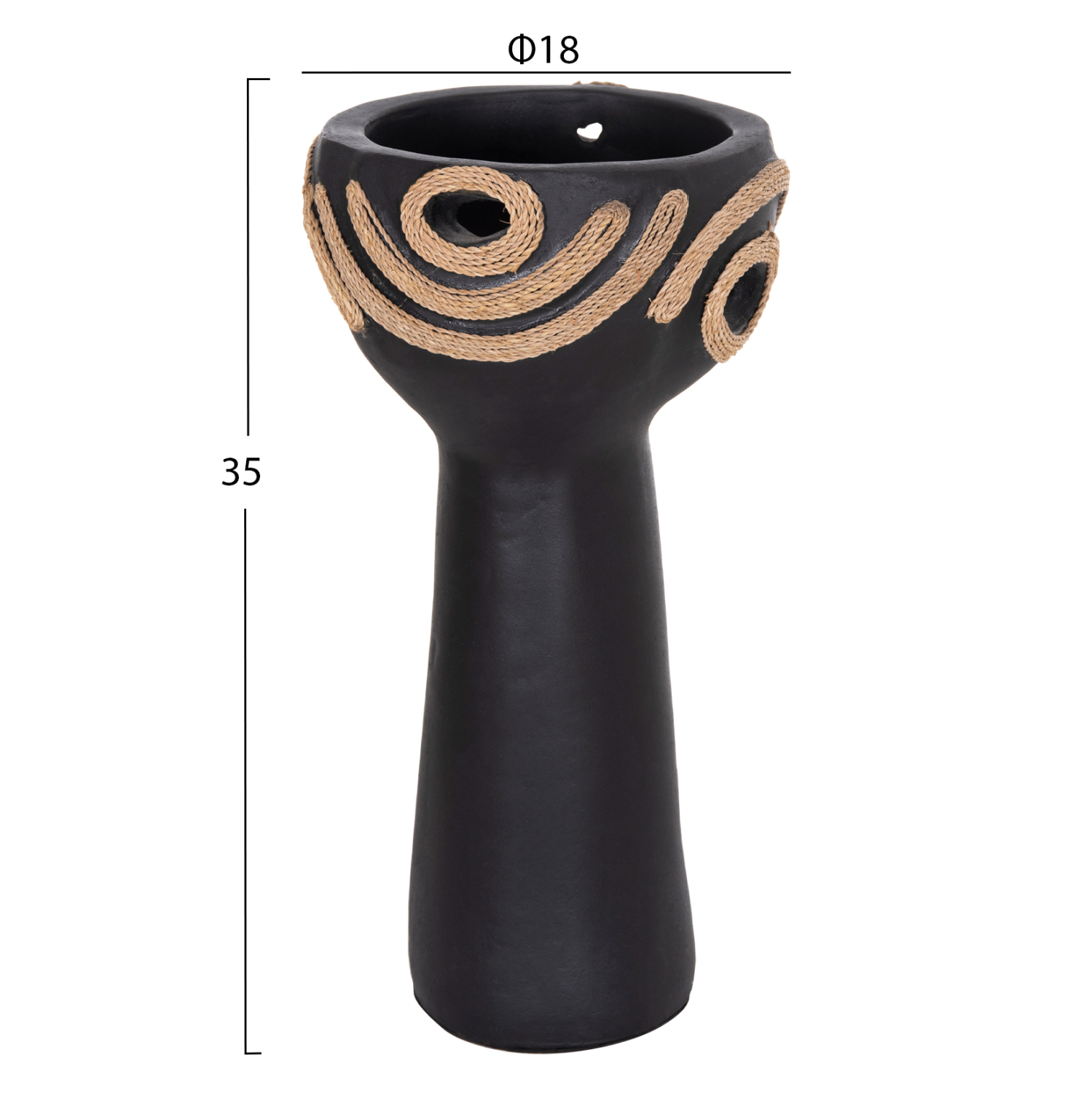 Το FB94679.01 είναι ένα εντυπωσιακό διακοσμητικό βάζο σε σχήμα ψηλού κυπέλλου που προσθέτει χαρακτήρα και ένταση σε κάθε χώρο. Η μαύρη τερακότα δημιουργεί μια δυναμική, γήινη παρουσία, ενώ η διακόσμηση με σχοινί agel πλευρικά προσφέρει φυσική υφή και αυθεντικό, χειροποίητο ύφος. Ιδανικό για κονσόλες, τραπέζια ή επαγγελματικούς χώρους που αναζητούν ιδιαίτερες λεπτομέρειες με premium αισθητική.