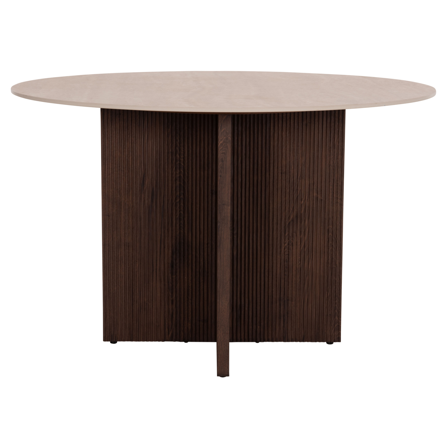 Το τραπέζι τραπεζαρίας FB918331 είναι στρογγυλό και αποτελεί νέα προσθήκη στην γκάμα μας. Η επίπεδη επιφάνειά του είναι κεραμική σε χρωματισμό TRAVERTINE STONE, ενώ η βάση του είναι σταυρωτή κατασκευασμένη εξολοκλήρου από MDF σε καφέ χρώμα, με όμορφες πτυχώσεις.