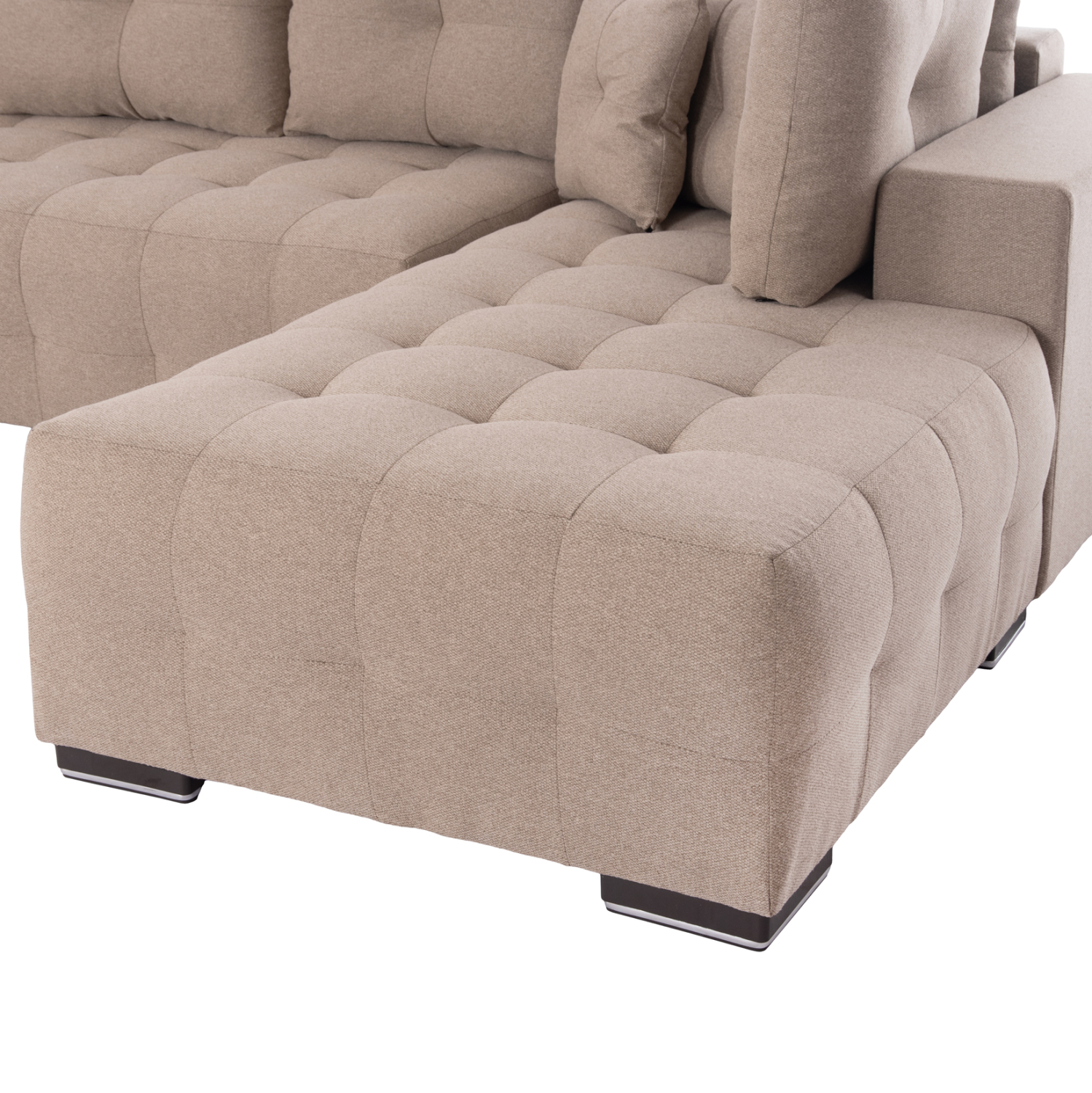 Ο FB93302.03R είναι ένας μεγάλος γωνιακός καναπές-κρεβάτι (ΔΕΞΙΑ ΓΩΝΙΑ). Η επένδυσή του είναι με εξαιρετικής ποιότητας ΜΠΕΖ ύφασμα με καπιτονέ τεχνοτροπία τόσο στα μαξιλάρια όσο και στο κάθισμα, ενώ τα πόδια είναι εξαιρετικά χαμηλά. Διαθέτει 5 μεγάλα μαξιλάρια πλάτης και 3 μικρότερα διακοσμητικά. Το κρεβάτι σχηματίζεται τραβώντας το κάθισμα του κυρίως καναπέ, «ρίχνοντας» ταυτόχρονα μπροστά την κοντή πλάτη. Εκεί ακριβώς δημιουργείται και ένας άκρως ικανοποιητικός αποθηκευτικός χώρος. Τέλος, το μπράτσο στην αριστερή πλευρά είναι φαρδύ και άνετο, ολοκληρώνοντας με τον καλύτερο τρόπο την απαράμιλλη πρακτικότητα αυτού του υπέροχου καναπέ.