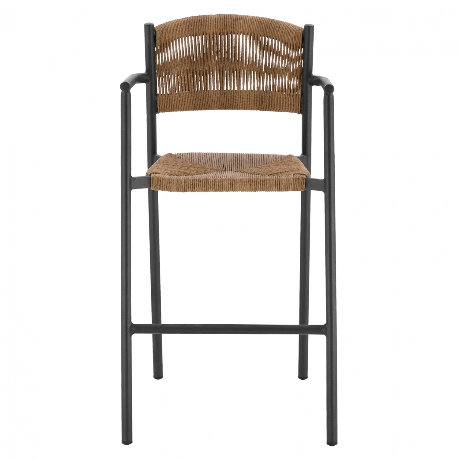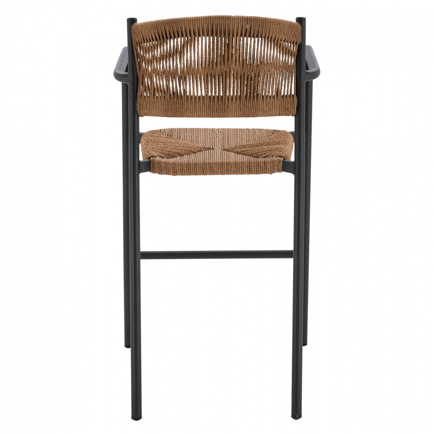 Μοντέρνο σκαμπό bar, κατασκευασμένo από σκελετό αλουμινίου σε γκρι απόχρωση, επενδυμένο με σχοινί στην πλάτη και στο κάθισμα σε μπεζ απόχρωση.