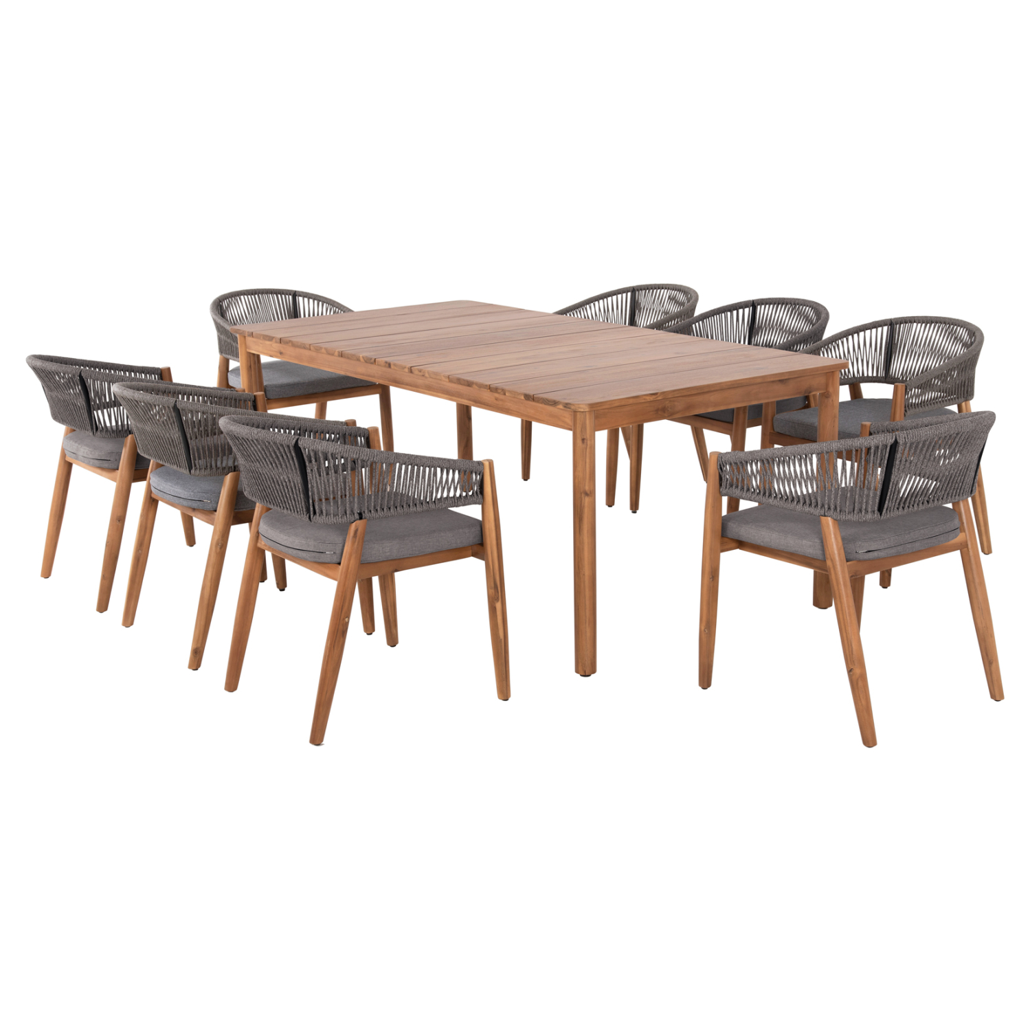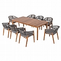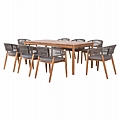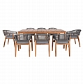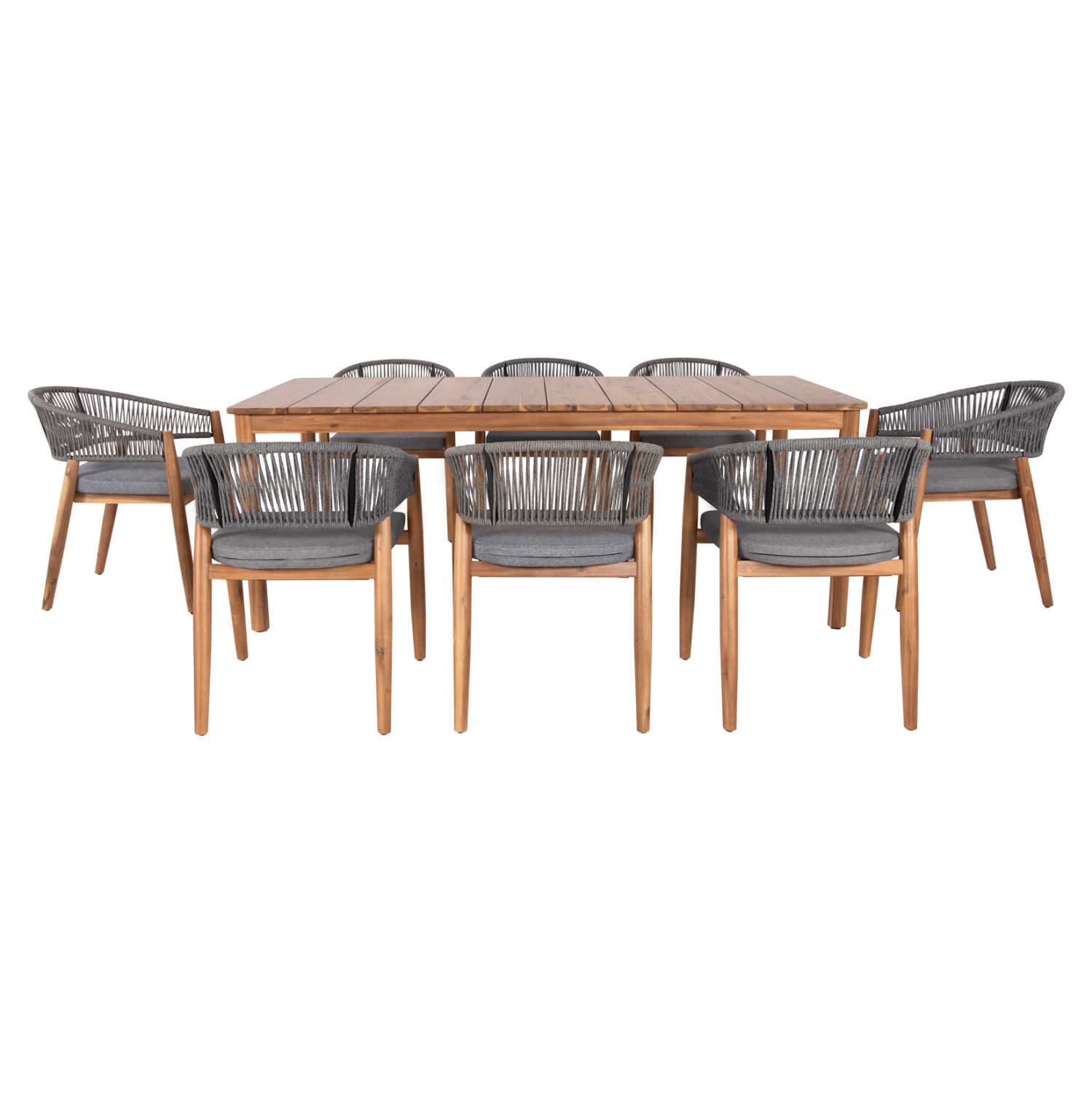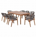Αυτό το σετ τραπεζαρίας εξωτερικού χώρου 9τμχ αποτελείται από ένα όμορφο χειροποίητο τραπέζι κατασκευασμένο εξολοκλήρου από φυσικό μασίφ ξύλο ΑΚΑΚΙΑΣ σε ΦΥΣΙΚΟ χρώμα, και από 8 καρέκλες τραπεζαρίας κατασκευασμένες επίσης από ξύλο ακακίας και σχοινί nylon σε ΓΚΡΙ χρώμα.