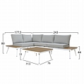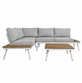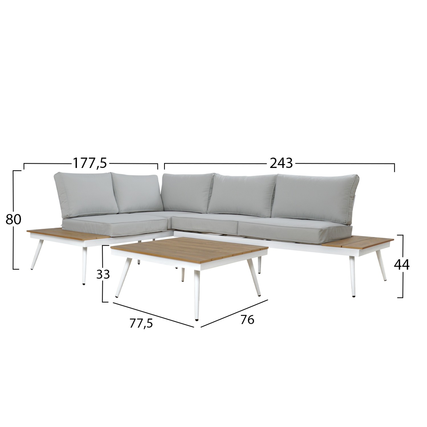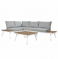 Καναπές γωνία με μεγάλα μαξιλάρια από ύφασμα σε γκρι χρώμα και σκελετό αλουμινίου σε λευκό χρώμα σε συνδυασμό με λεπτομέρειες από υλικό polywood σε απόχρωση του ξύλου.