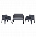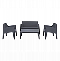 Ένα ορθογώνιο τραπεζάκι, 2 στοιβαζόμενες πολυθρόνες κι έναν 2-θέσιο καναπέ, τα οποία είναι εξολοκλήρου κατασκευασμένα από πολυπροπυλένιο σε ΓΚΡΙ χρώμα. Σχεδιαστικά, είναι λιτό και μπορεί να χρησιμοποιηθεί με πολλούς τρόπους προσφέροντας πρακτική και ανθεκτική χρήση. Ιδανική πρόταση για χρήση σε εξωτερικούς χώρους, είτε επαγγελματικούς (χώροι δεξιώσεων, εταιρείες catering, κλπ.) είτε για το σπίτι.