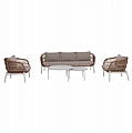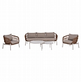 Το σετ περιλαμβάνει έναν 3θέσιο καναπέ, δύο πολυθρόνες ίδιας σχεδίασης και δύο στρογγυλά τραπεζάκια με κεραμικές επιφάνειες, δημιουργώντας έναν καλαίσθητο και λειτουργικό χώρο εξωτερικής καθιστικής απόλαυσης.