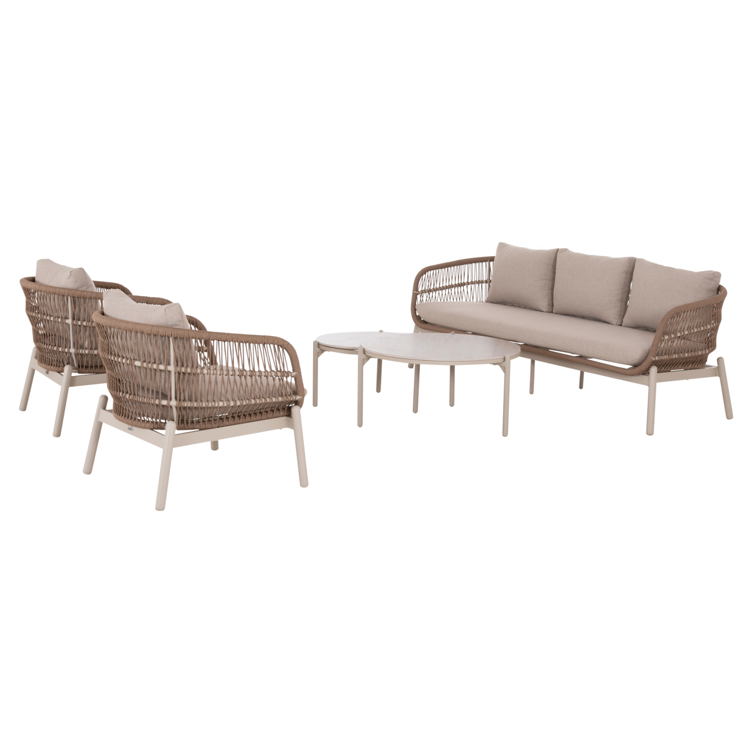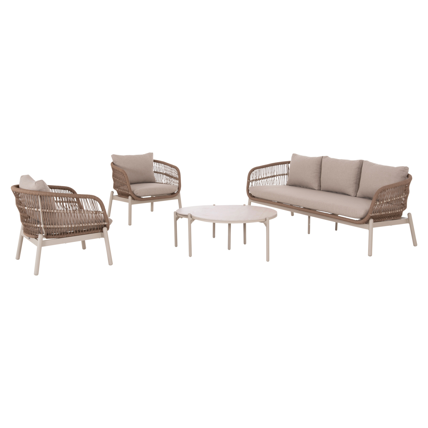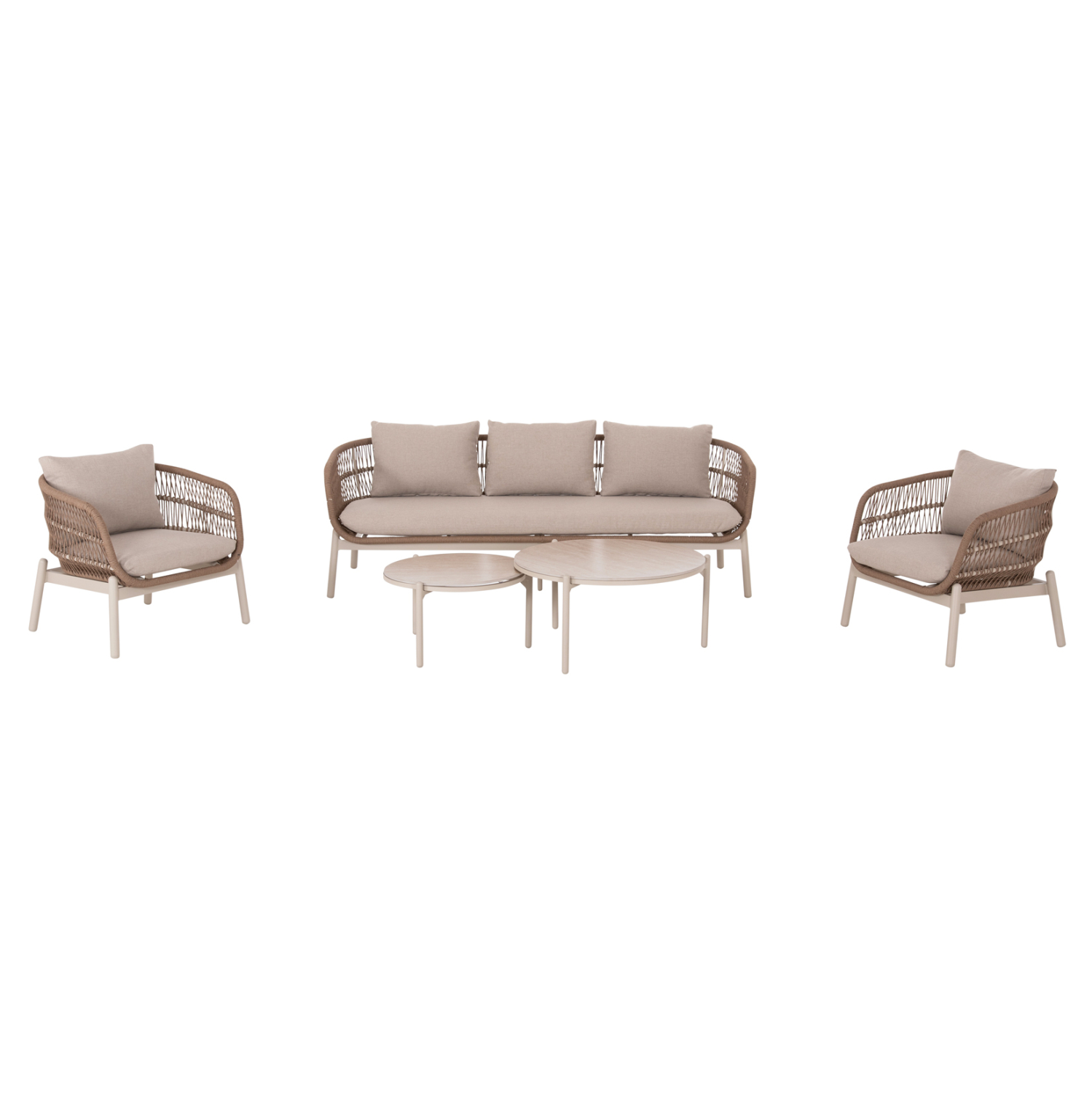 Το σετ περιλαμβάνει έναν 3θέσιο καναπέ, δύο πολυθρόνες ίδιας σχεδίασης και δύο στρογγυλά τραπεζάκια με κεραμικές επιφάνειες, δημιουργώντας έναν καλαίσθητο και λειτουργικό χώρο εξωτερικής καθιστικής απόλαυσης.