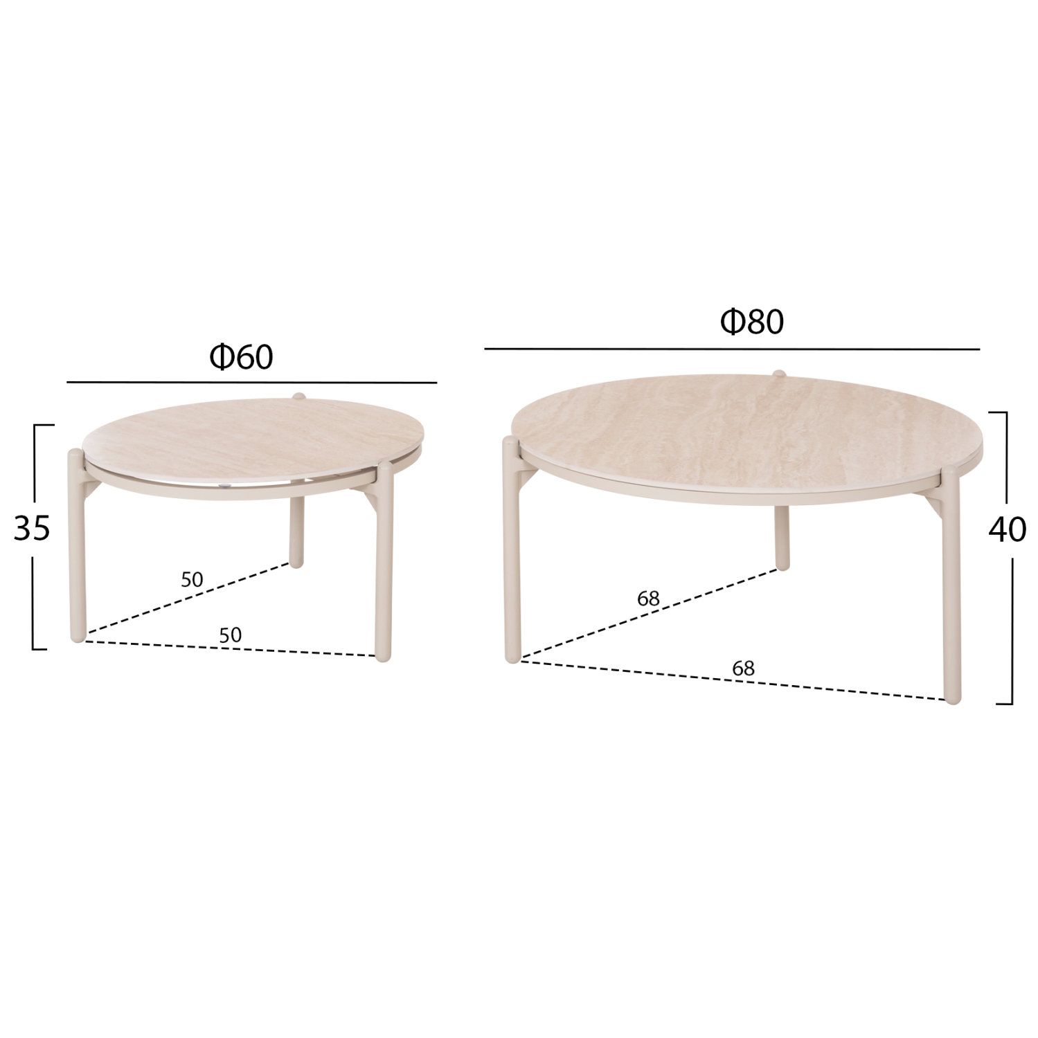•Τραπεζάκι Α: Φ80 x 40Υ εκ.----Απόσταση ποδιών: 68x68 εκ.
